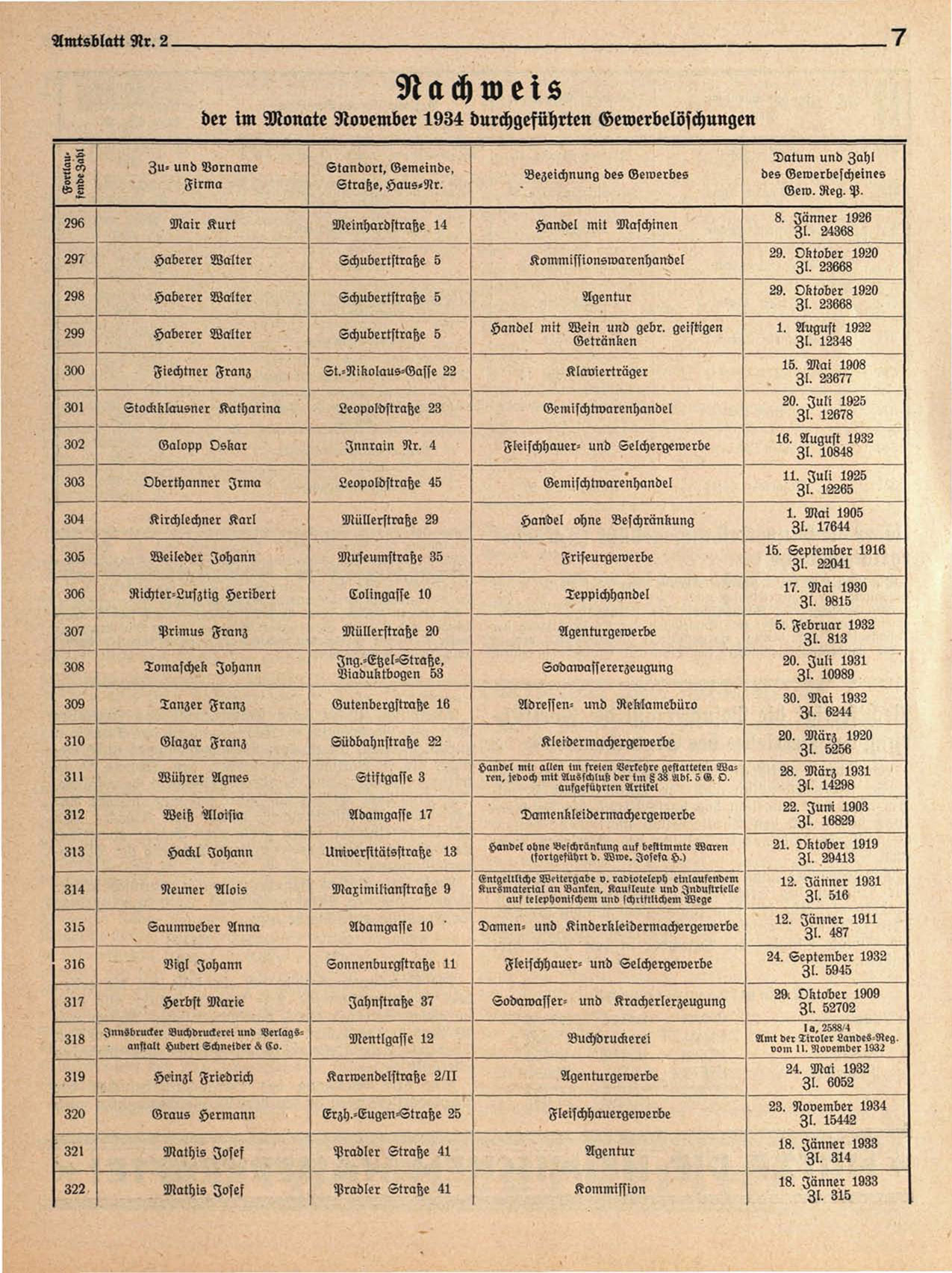 der im Monate November 1934 durchgeführten Gewerbelöschungen