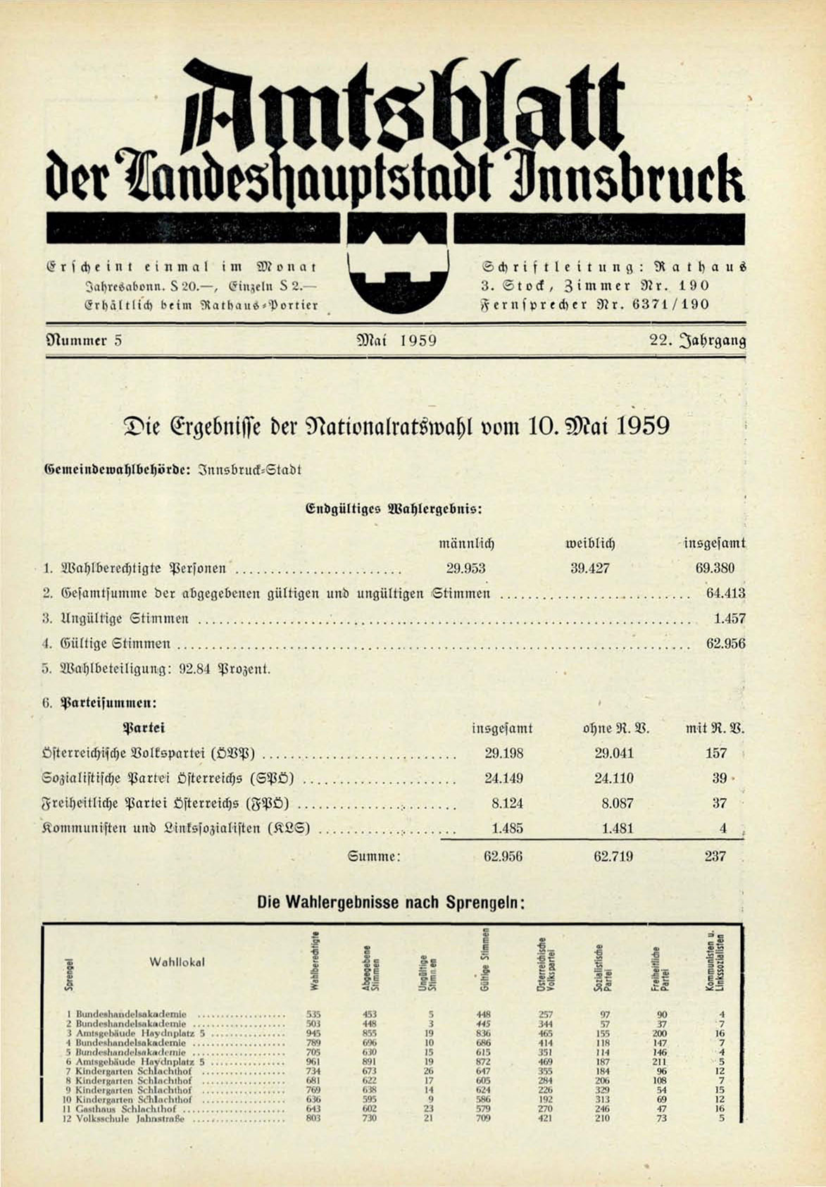 Die Ergebnisse der Nationalratswahl vom 10. Mai 1959