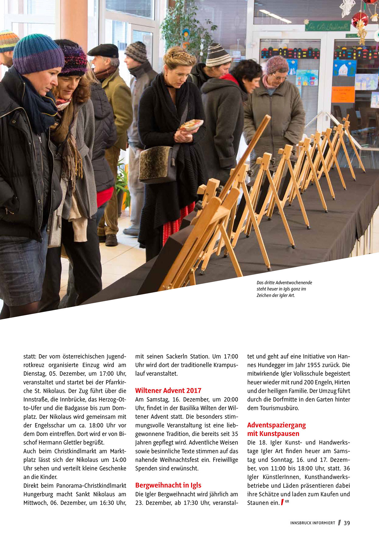 Die 18. Igler Kunst- und Handwerkstage Igler Art finden heuer am Samstag und Sonntag, 16. und 17. Dezember, von 11:00 bis 18:00 Uhr, statt. 36