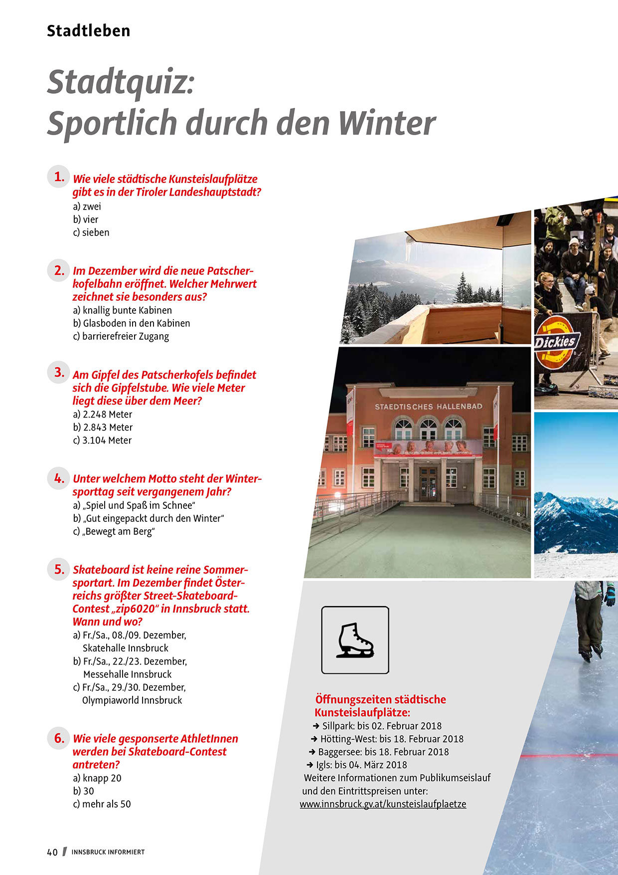 sportart. Im Dezember findet Österreichs größter Street-SkateboardContest „zip6020“ in Innsbruck statt.