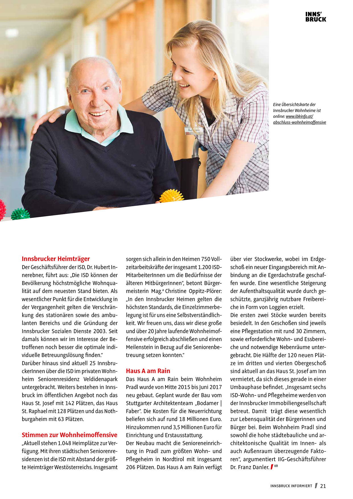 „Aktuell stehen 1.048 Heimplätze zur Verfügung. Mit ihren städtischen Seniorenresidenzen ist die ISD mit Abstand der größte Heimträger Westösterreichs. Insgesamt