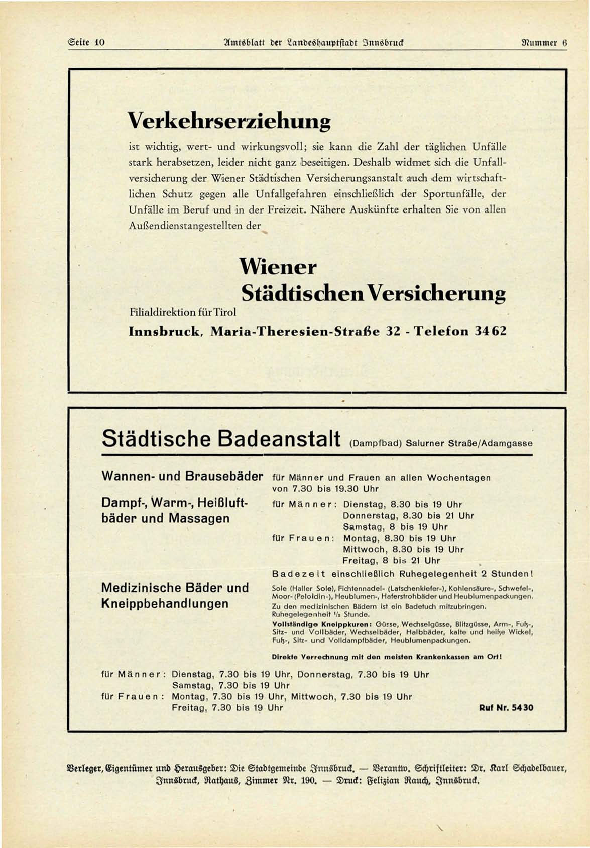Verleger, Eigentümer und Herausgeber: Die Stadtgemeinde Innsbruck. — Verantw. Schriftleiter: Dr. Karl Schadelbauer,