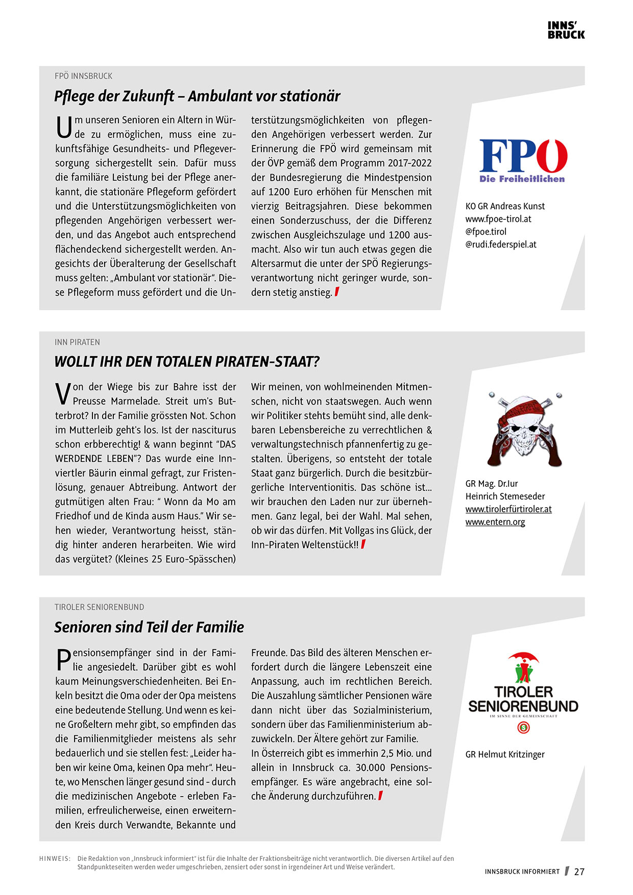 H I N W EI S : Die Redaktion von „Innsbruck informiert“ ist für die Inhalte der Fraktionsbeiträge nicht verantwortlich. Die diversen Artikel auf den