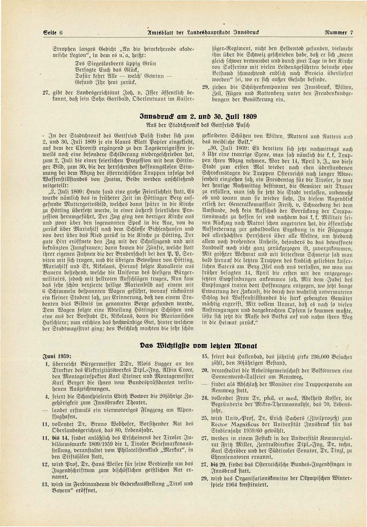 zum 2. I n l i die einer feierlichen Prozession mit dem Höttinger B i l d , zum 30. die der herrschenden hoffnungslosen S t i m mung bei dem Abzug der österreichischen Truppen infolge des