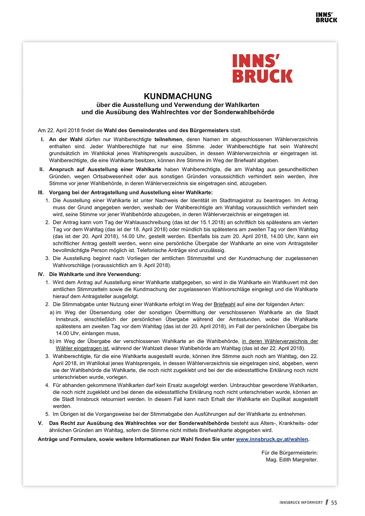 Innsbruck, einschließlich der persönlichen Übergabe während der Amtsstunden, wobei die Wahlkarte
