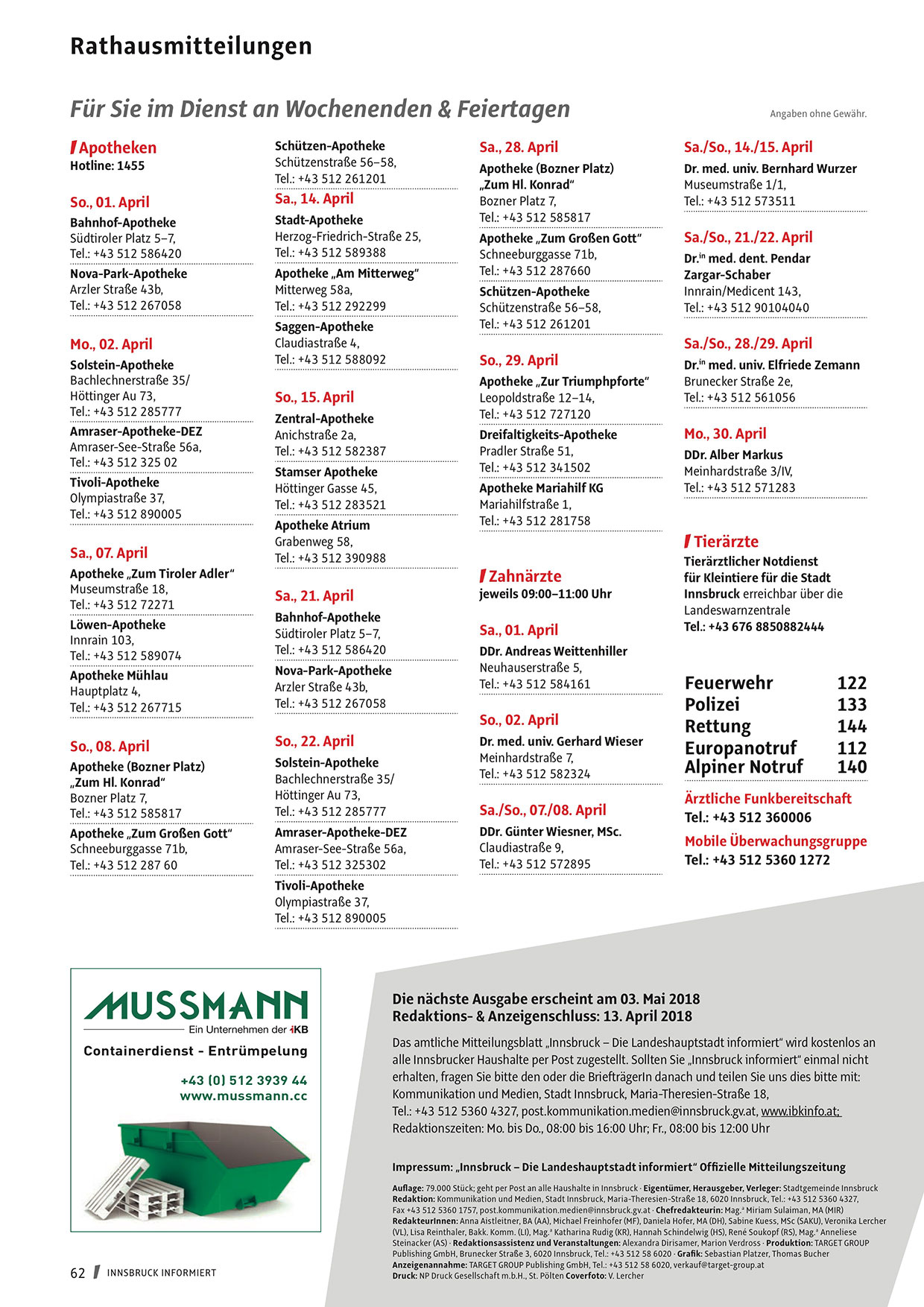Auflage: 79.000 Stück; geht per Post an alle Haushalte in Innsbruck · Eigentümer, Herausgeber, Verleger: Stadtgemeinde Innsbruck