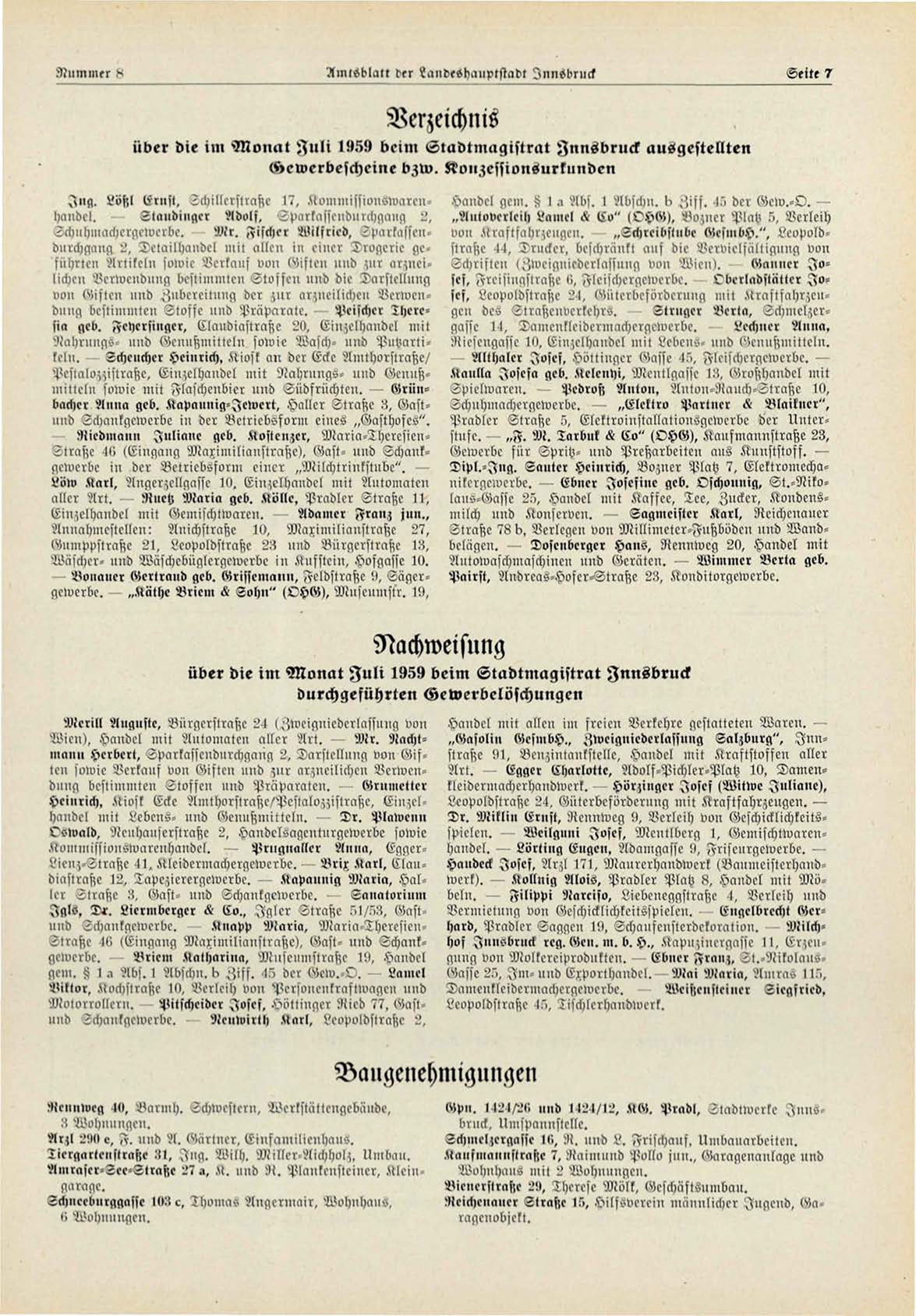 über die im Monat Fuli 1959 beim Stadtmagistrat Innsbruck