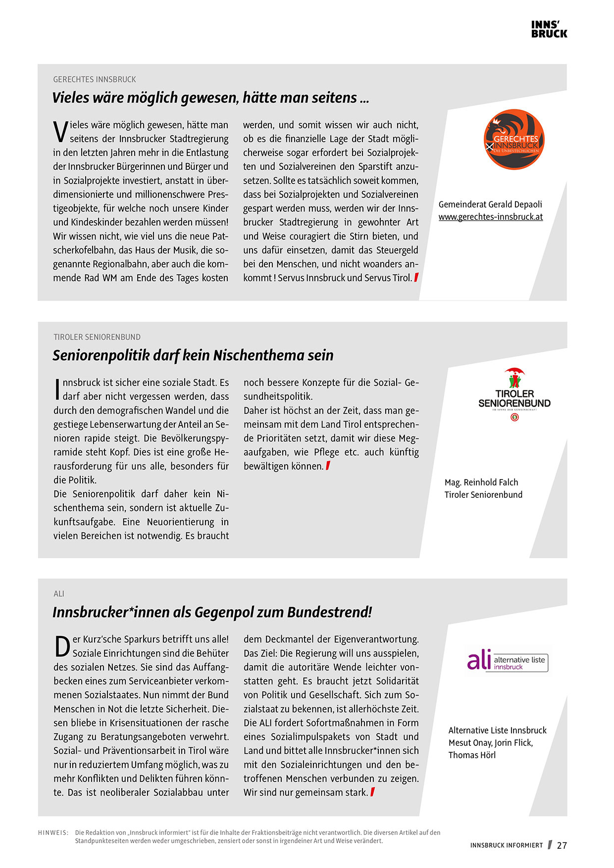 H I N W EI S : Die Redaktion von „Innsbruck informiert“ ist für die Inhalte der Fraktionsbeiträge nicht verantwortlich. Die diversen Artikel auf den