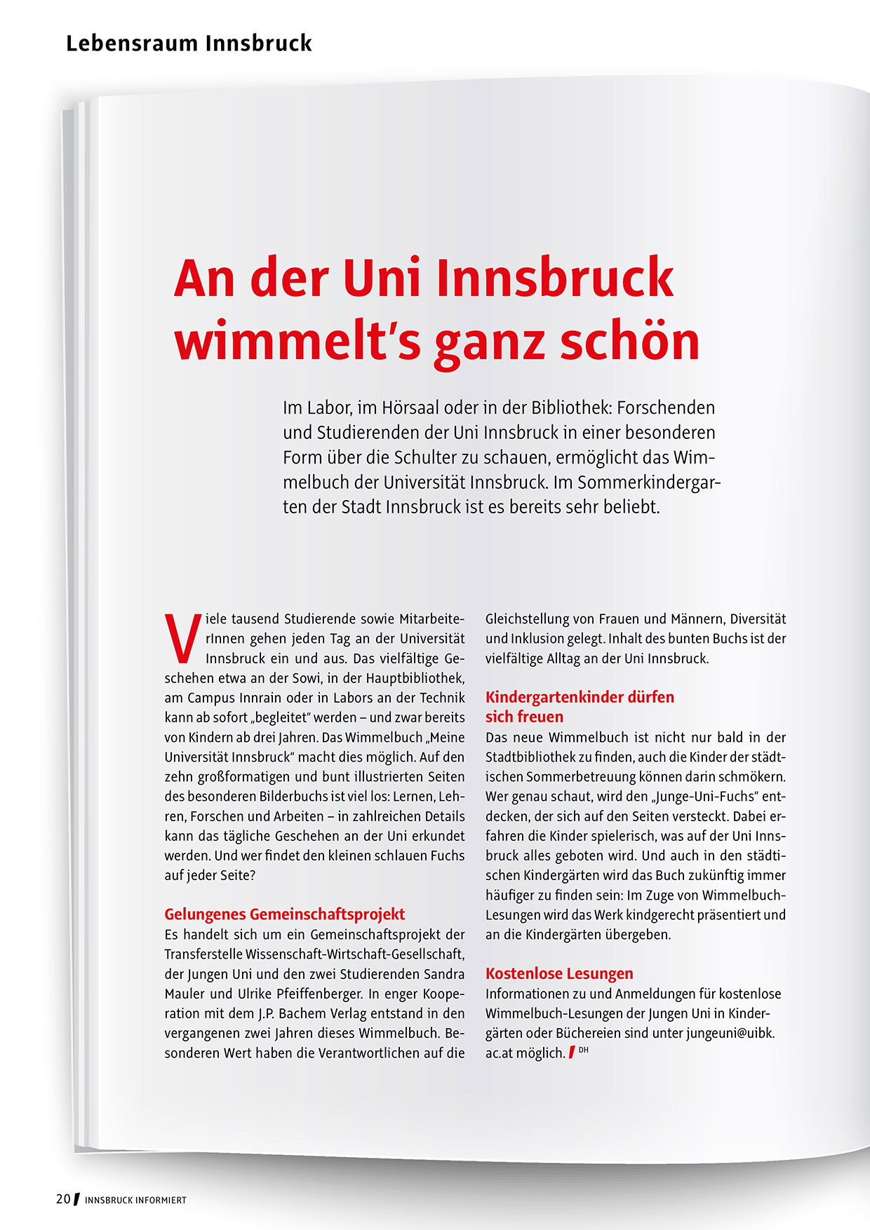 Wer genau schaut, wird den „Junge-Uni-Fuchs“ entdecken, der sich auf den Seiten versteckt. Dabei erfahren die Kinder spielerisch, was auf der Uni Innsbruck alles geboten wird. Und auch in den städtischen Kindergärten wird das Buch zukünftig immer