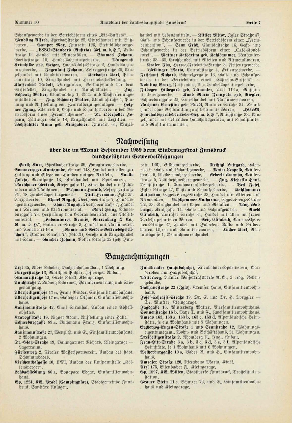 über die im Monat September 1959 beim Stadtmagistrat Innsbruck