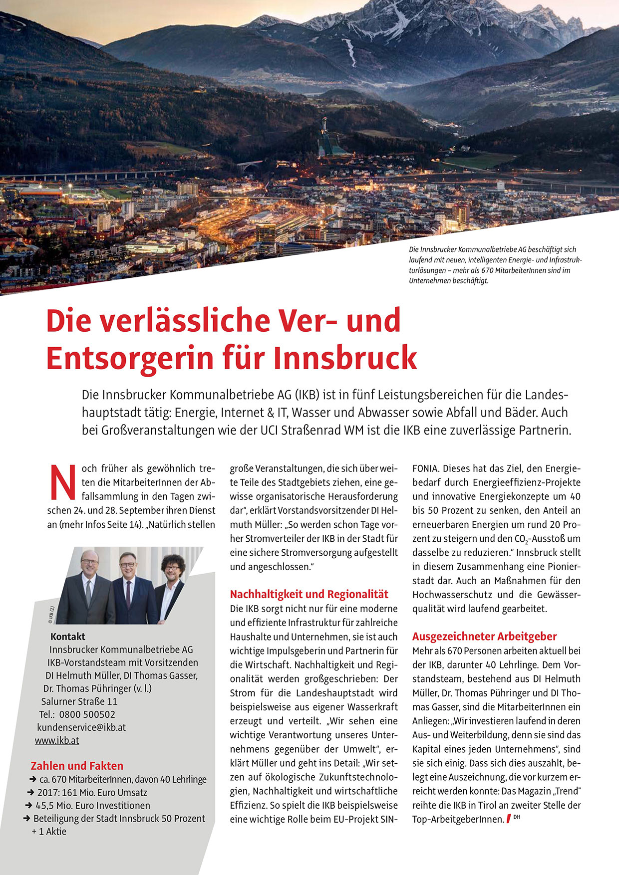 Die Innsbrucker Kommunalbetriebe AG (IKB) ist in fünf Leistungsbereichen für die Landeshauptstadt tätig: Energie, Internet & IT, Wasser und Abwasser sowie Abfall und Bäder. Auch