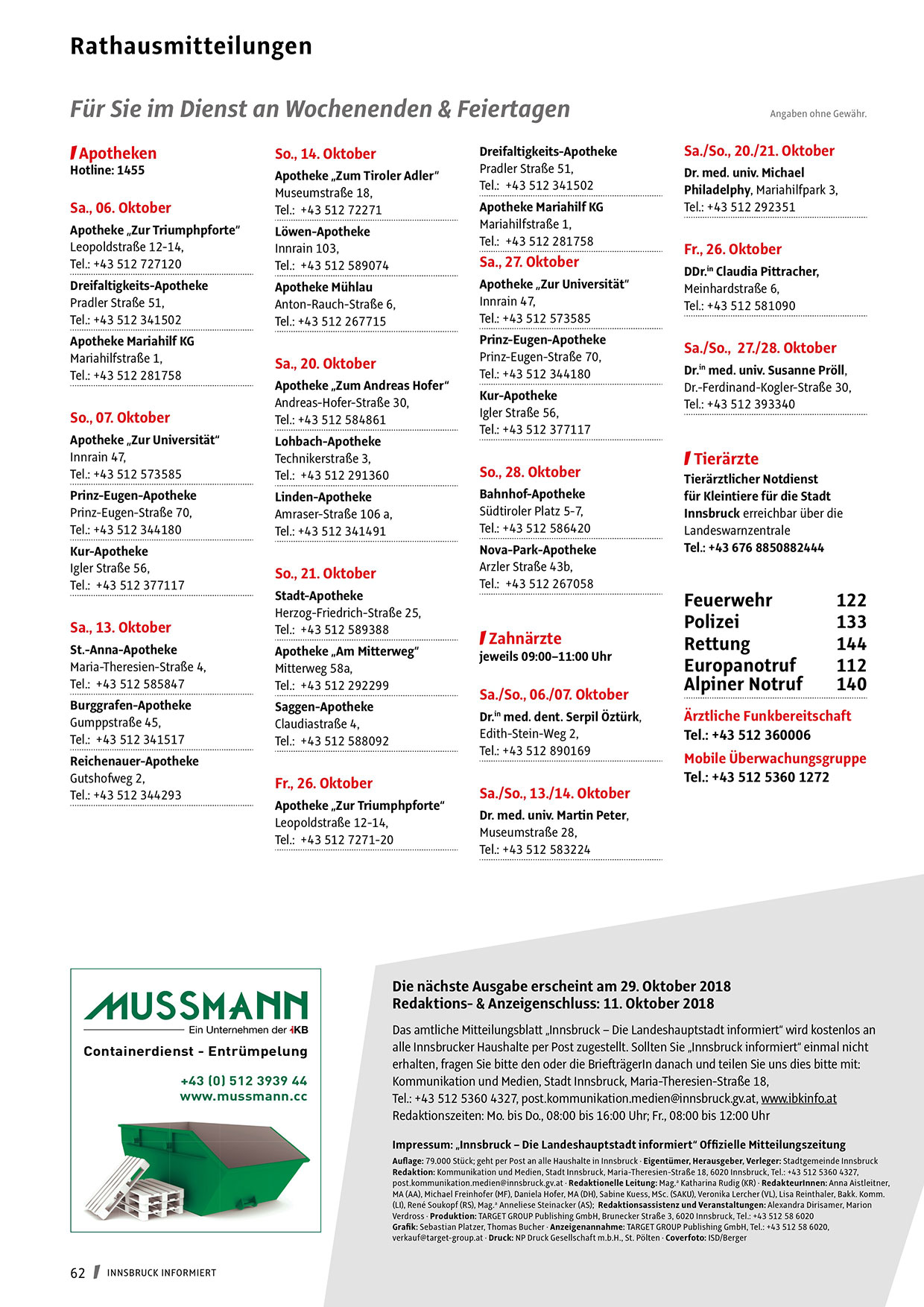 Impressum: „Innsbruck – Die Landeshauptstadt informiert“ Offizielle Mitteilungszeitung