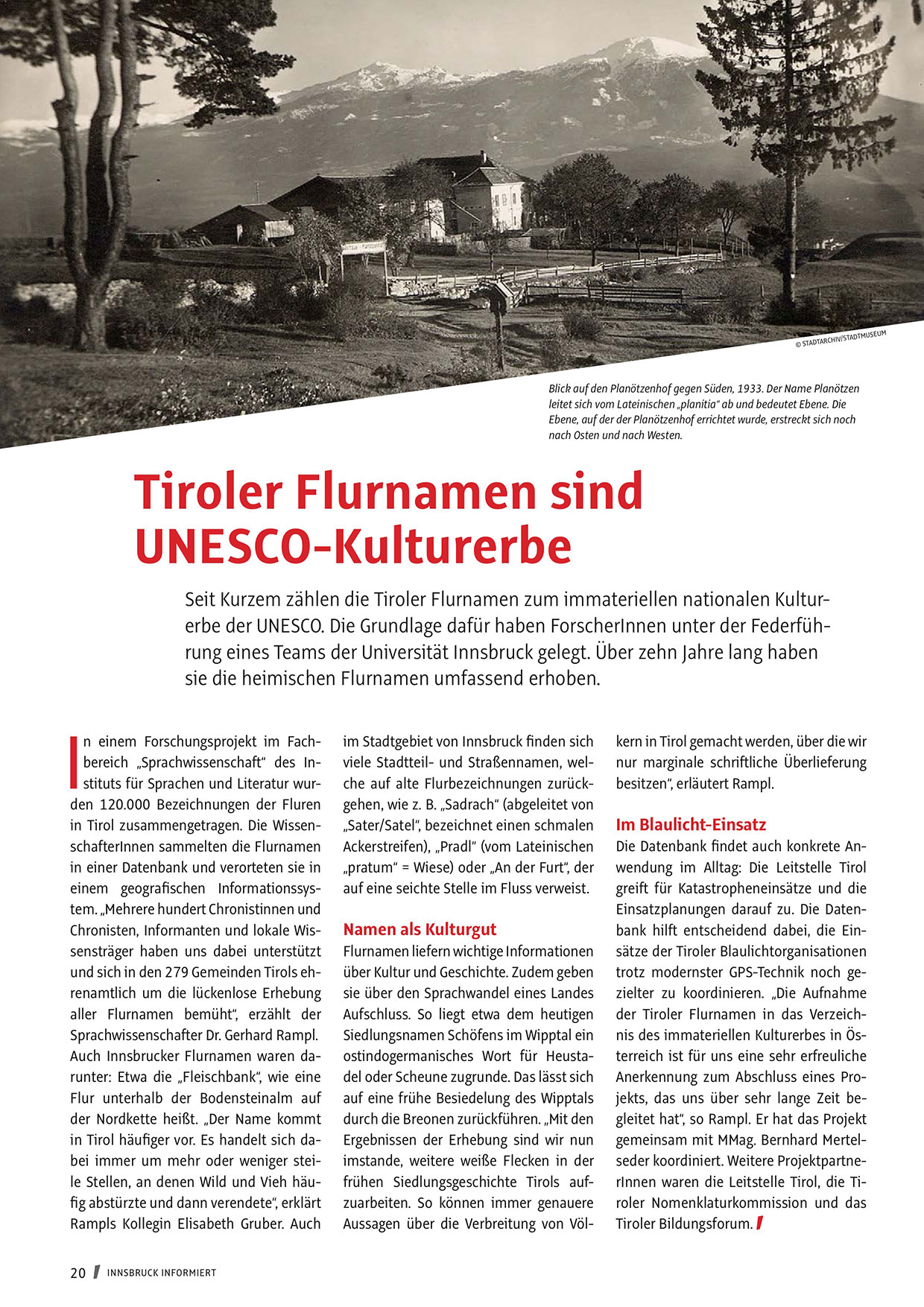 Seit Kurzem zählen die Tiroler Flurnamen zum immateriellen nationalen Kulturerbe der UNESCO. Die Grundlage dafür haben ForscherInnen unter der Federführung eines Teams der Universität Innsbruck gelegt. Über zehn Jahre lang haben