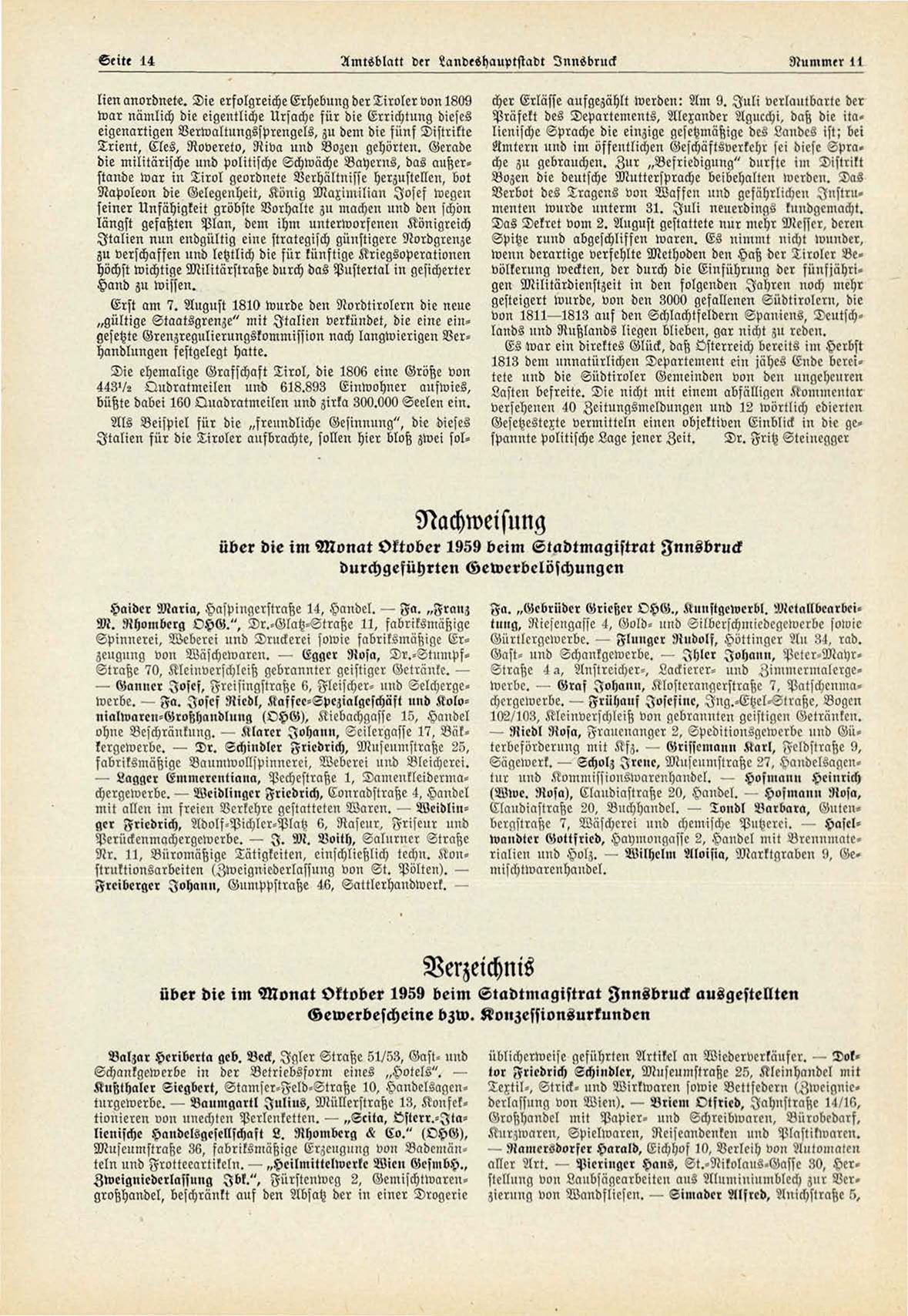 über die im Monat Oktober 1959 beim Stadtmagistrat Innsbruck ausgestellten