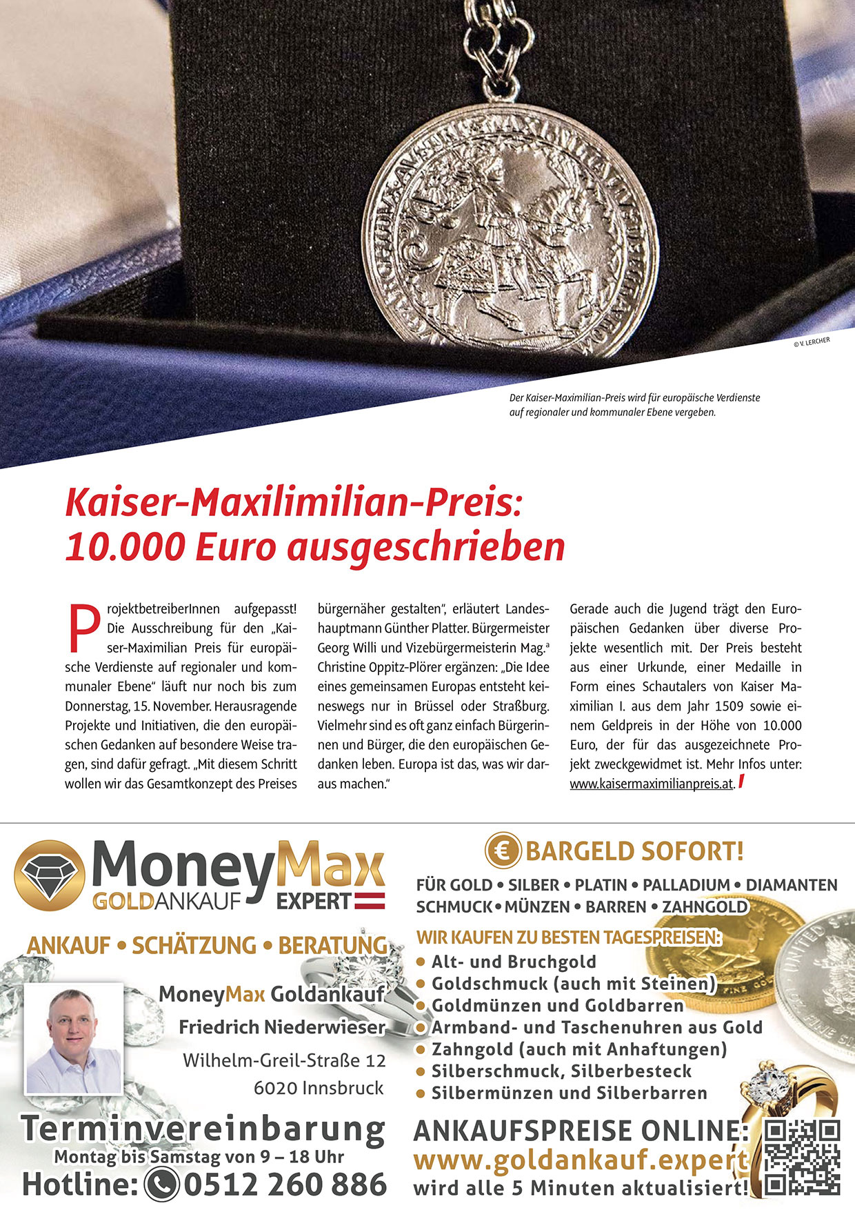 Die Ausschreibung für den „Kaiser-Maximilian Preis für europäische Verdienste auf regionaler und kommunaler Ebene“ läuft nur noch bis zum