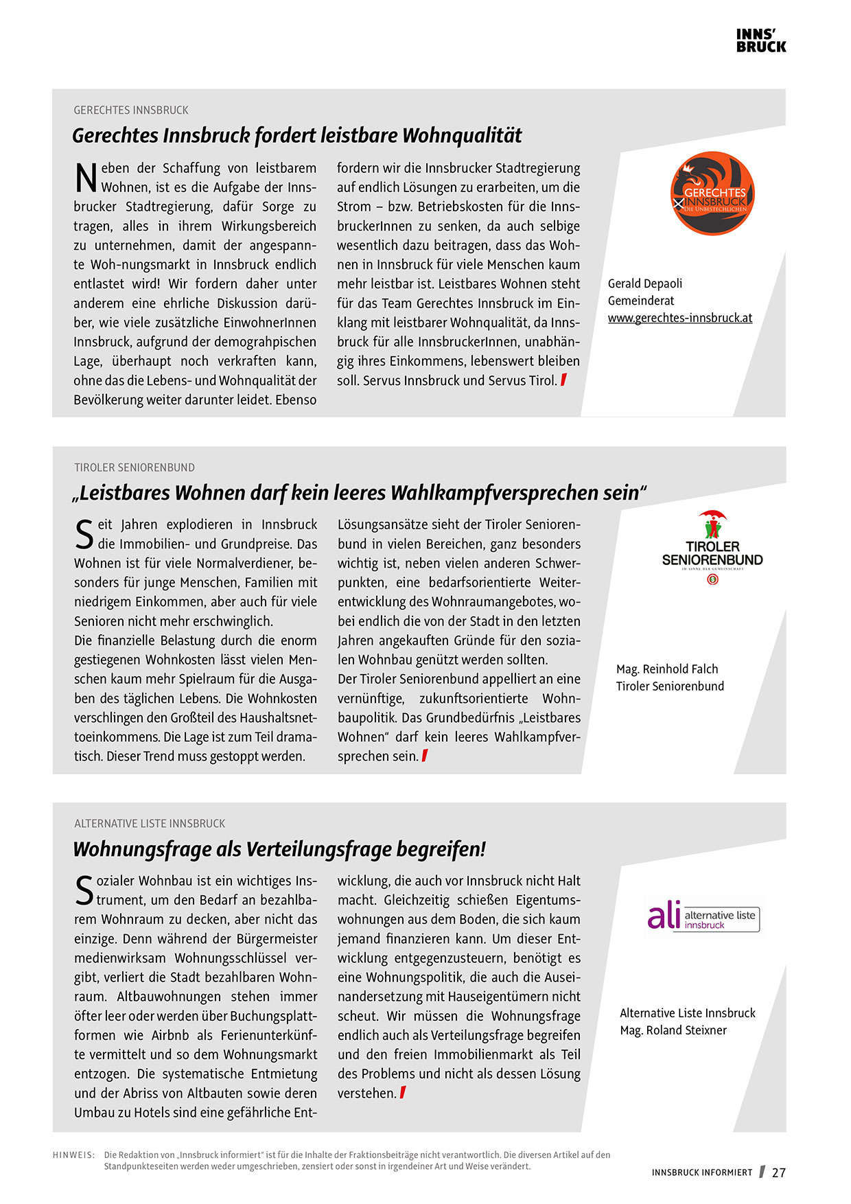 H I N W EI S : Die Redaktion von „Innsbruck informiert“ ist für die Inhalte der Fraktionsbeiträge nicht verantwortlich. Die diversen Artikel auf den