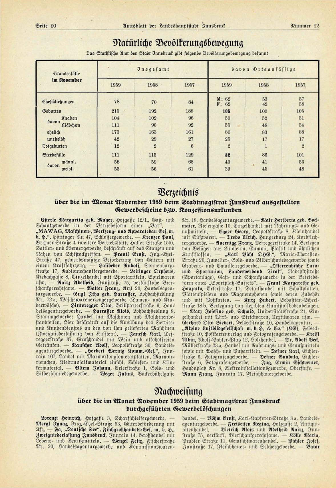 über die im Monat November 1959 beim Stadtmagistrat Innsbruck ausgestellten