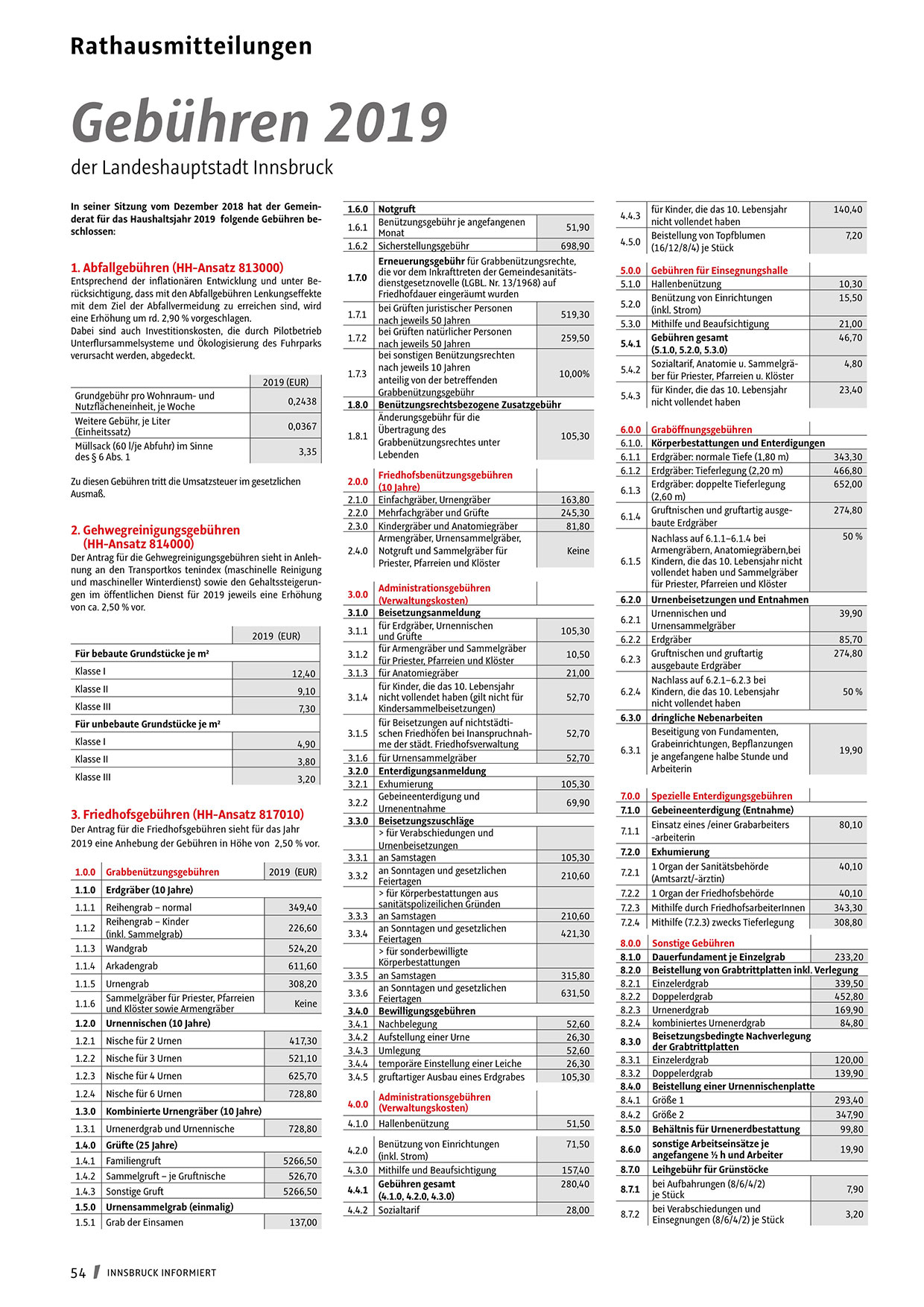 In seiner Sitzung vom Dezember 2018 hat der Gemeinderat für das Haushaltsjahr 2019 folgende Gebühren beschlossen: