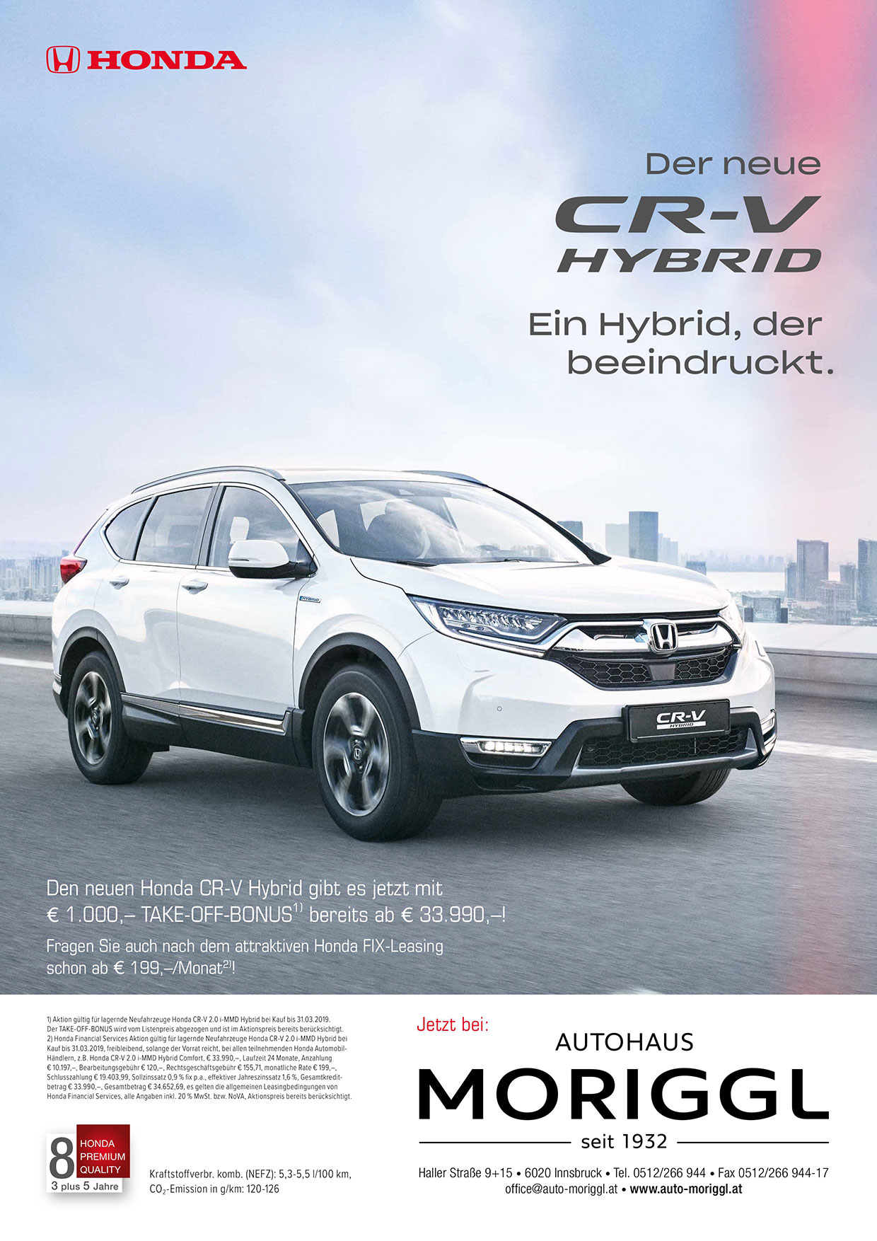 Kauf bis 31.03.2019, freibleibend, solange der Vorrat reicht, bei allen teilnehmenden Honda AutomobilHändlern, z.B. Honda CR-V 2.0 i-MMD Hybrid Comfort, € 33.990,–, Laufzeit 24 Monate, Anzahlung