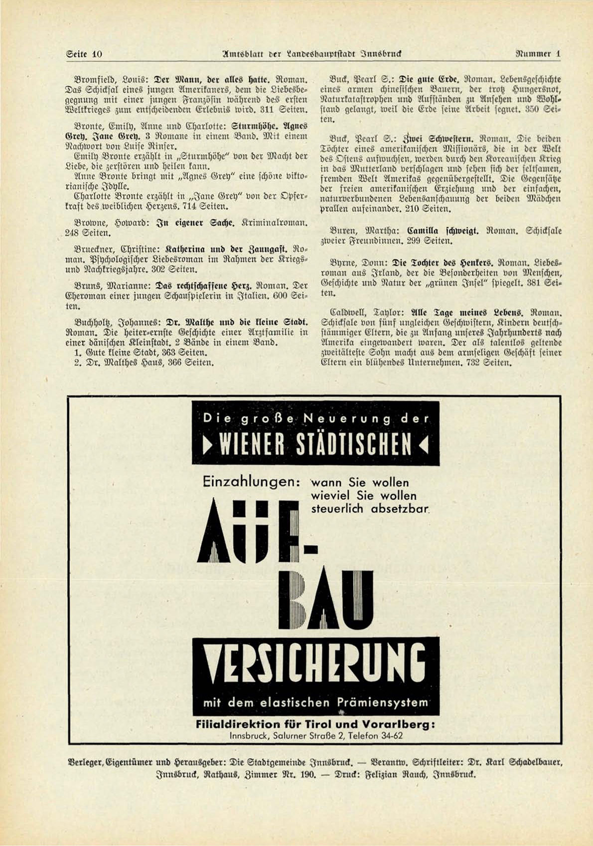Verleger, Eigentümer und Herausgeber: Die Stadtgemeinde Innsbruck. — Verantw. Schriftleiter: D r . K a r l Schadelbauei,