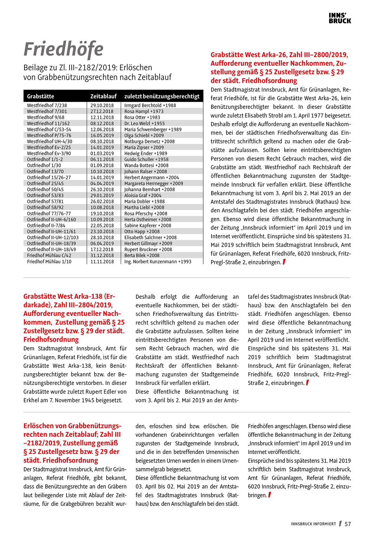 03. April bis 02. Mai 2019 an der Amtstafel des Stadtmagistrates Innsbruck (Rathaus) bzw. den Anschlagtafeln bei den städt.