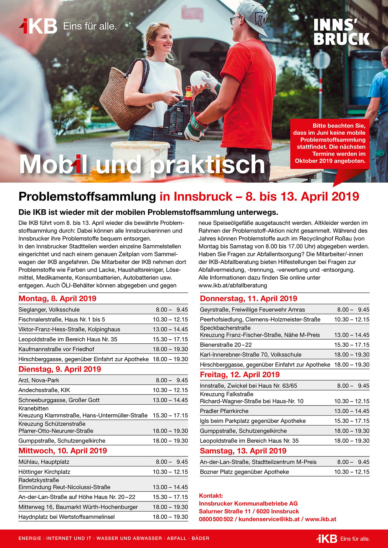 Die IKB führt vom 8. bis 13. April wieder die bewährte Problemstoffsammlung durch: Dabei können alle Innsbruckerinnen und
