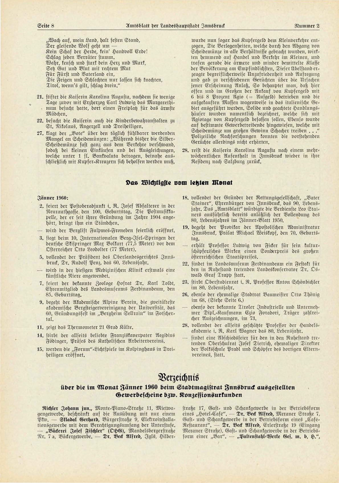 über die im Monat Fänner 1960 beim Stadtmagistrat Innsbruck ausgestellten