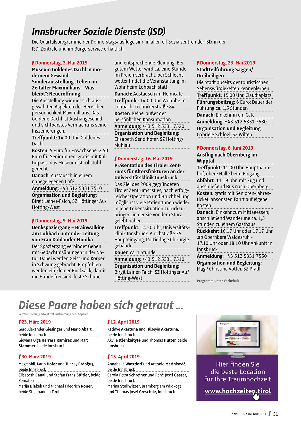 Die Quartalsprogramme der Donnerstagsausflüge sind in allen elf Sozialzentren der ISD, in der