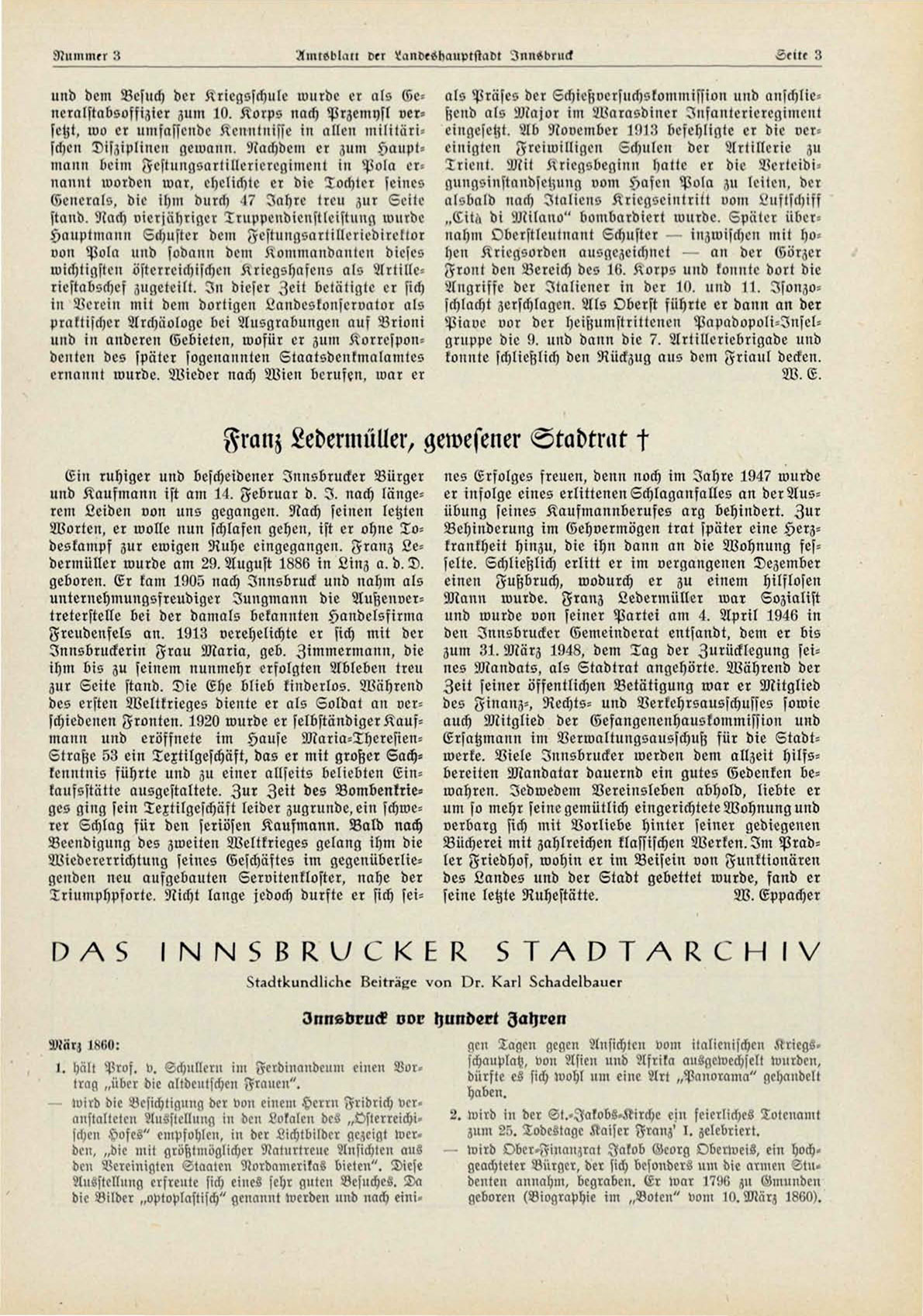 Ersatzmann im Verwaltungsausschuß für die Stadtwerke. Viele Innsbrucker werden dem allzeit hilfsbereiten Mandatar dauernd ein gutes Gedenken bewahren. Jedwedem Vereinsleben abhold, liebte er