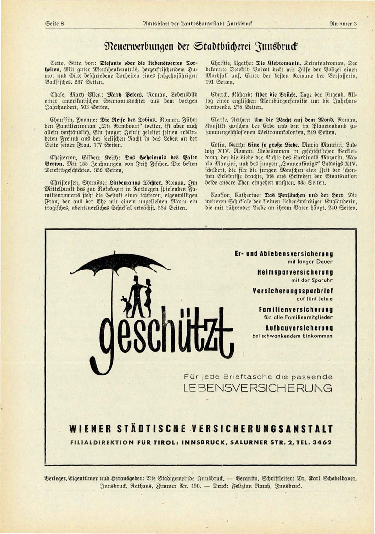 Beileger, Eigentümer und Herausgeber: Die Stadtgemeindc Innsbruck. — Verantw. Schriftleiter: Dr. Karl Schadelbaner,