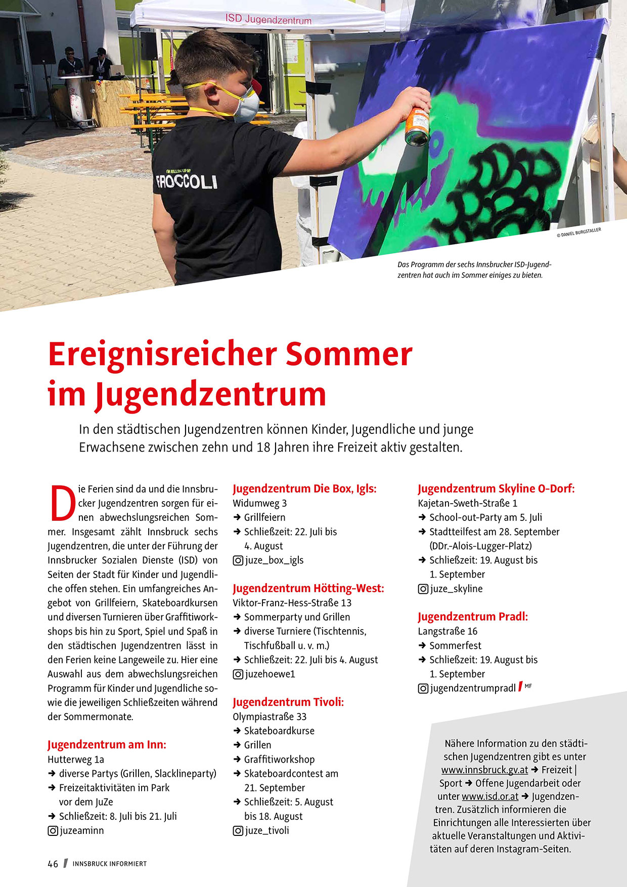 ie Ferien sind da und die Innsbrucker Jugendzentren sorgen für einen abwechslungsreichen Sommer. Insgesamt zählt Innsbruck sechs