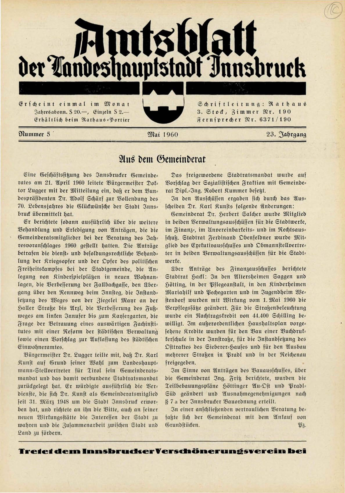 Eine Geschäftsfitzung des Innsbrucker Gemeinderates am ^ l . A p r i l I960 leitete Bürgermeister Doktor lugger mit der Mitteilung ein, daß er dem Bundespräsidenten Dr. Adolf Schärf zur Vollendung des