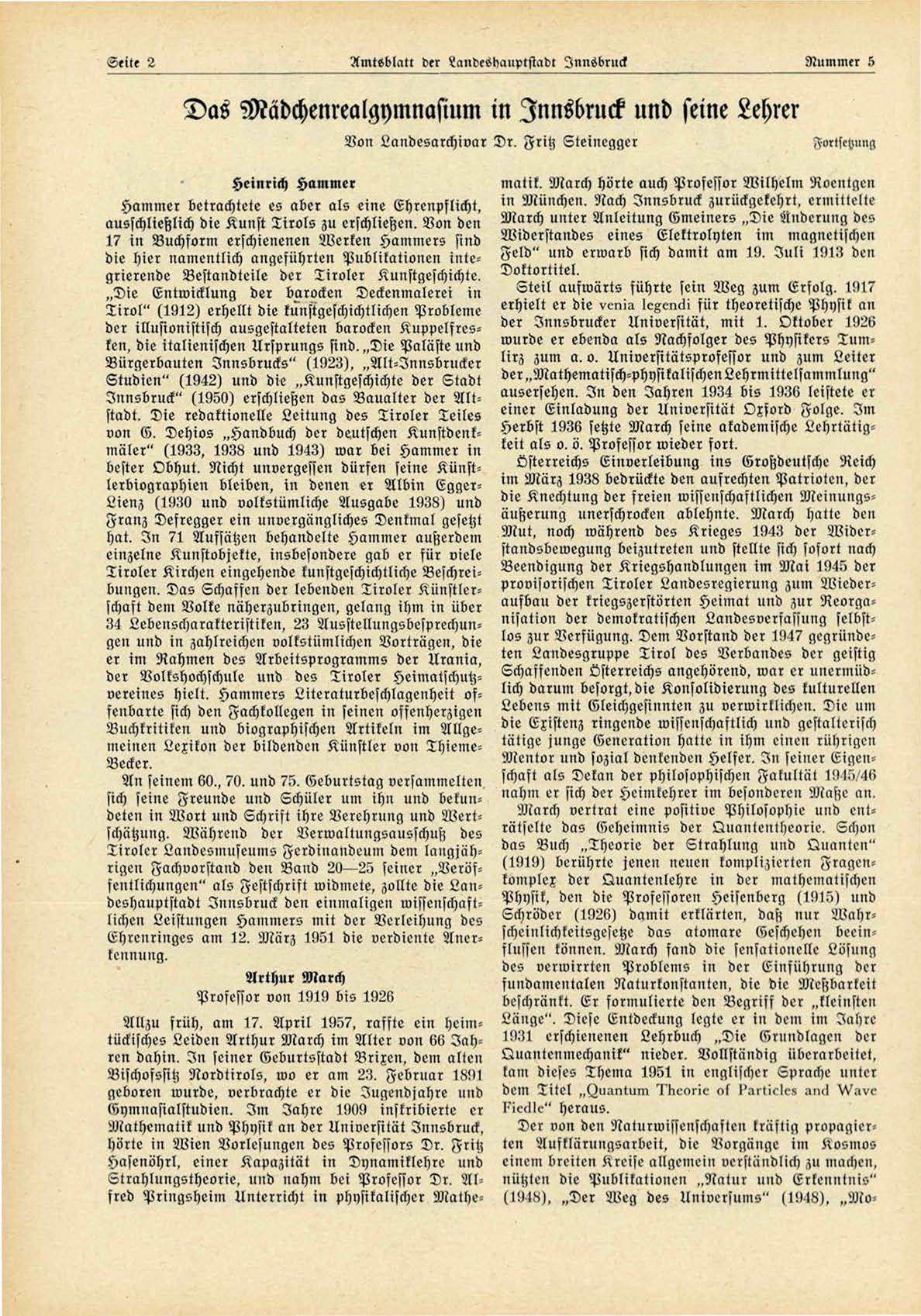 Allzu früh, am 17. A p r i l 1957, raffte ein heimtückisches Leiden Arthur March im Alter von 66 Jahren dahin. I n seiner Geburtsstadt Brixen, dem alten