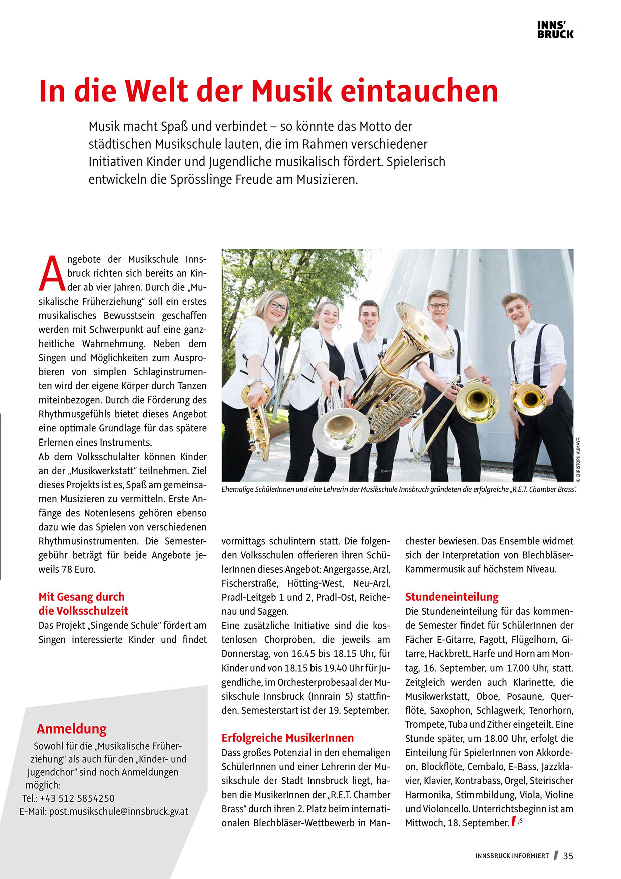 Ehemalige SchülerInnen und eine Lehrerin der Musikschule Innsbruck gründeten die erfolgreiche „R.E.T. Chamber Brass“.
