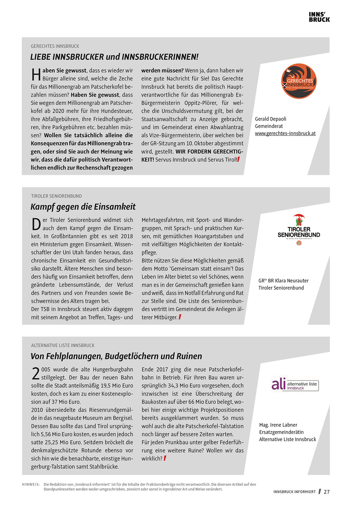 H I N W EI S : Die Redaktion von „Innsbruck informiert“ ist für die Inhalte der Fraktionsbeiträge nicht verantwortlich. Die diversen Artikel auf den