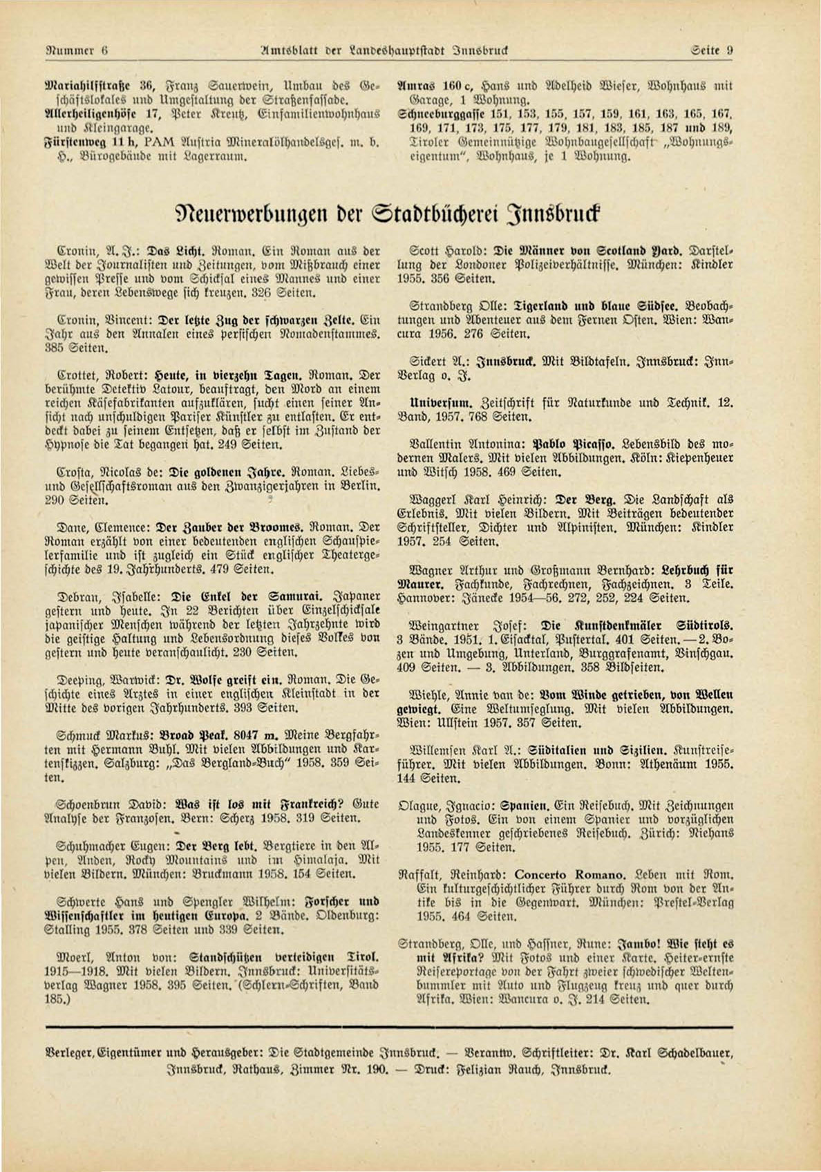 Verleger,Eigentümer und Heransgeber: Die Stadtgciiicindc Innsbruck. — Verantw. Schriftleiter: Dr. Karl Schadelbauer,