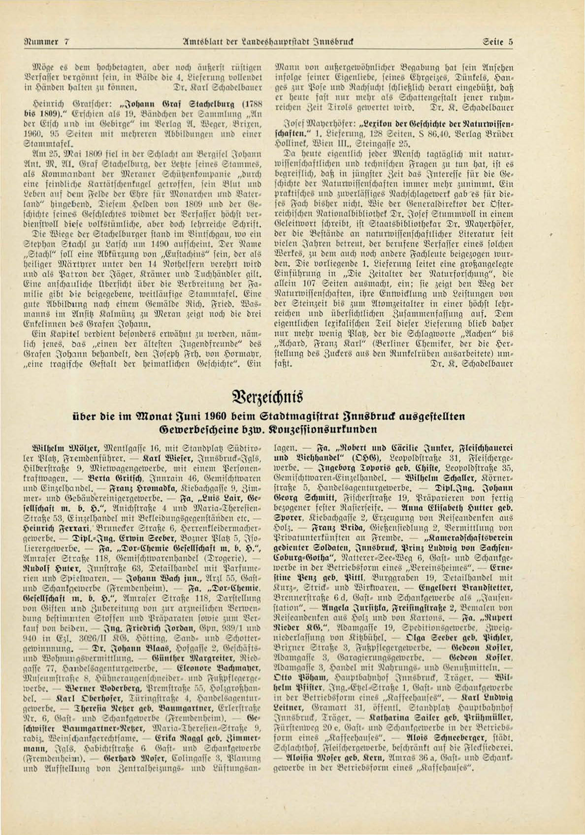 über die im Monat Funi 1960 beim Stadtmagistrat Innsbruck ausgestellten