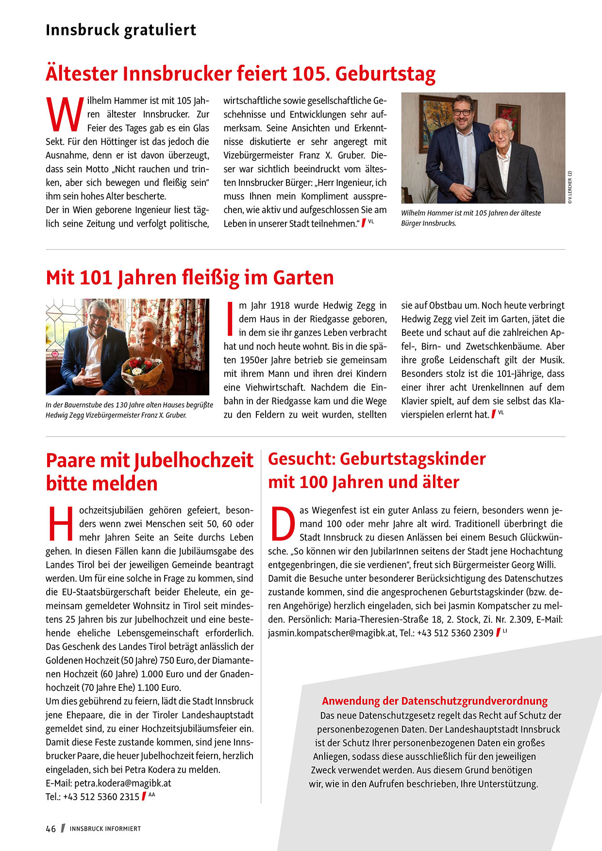 Stadt Innsbruck zu diesen Anlässen bei einem Besuch Glückwünsche. „So können wir den JubilarInnen seitens der Stadt jene Hochachtung