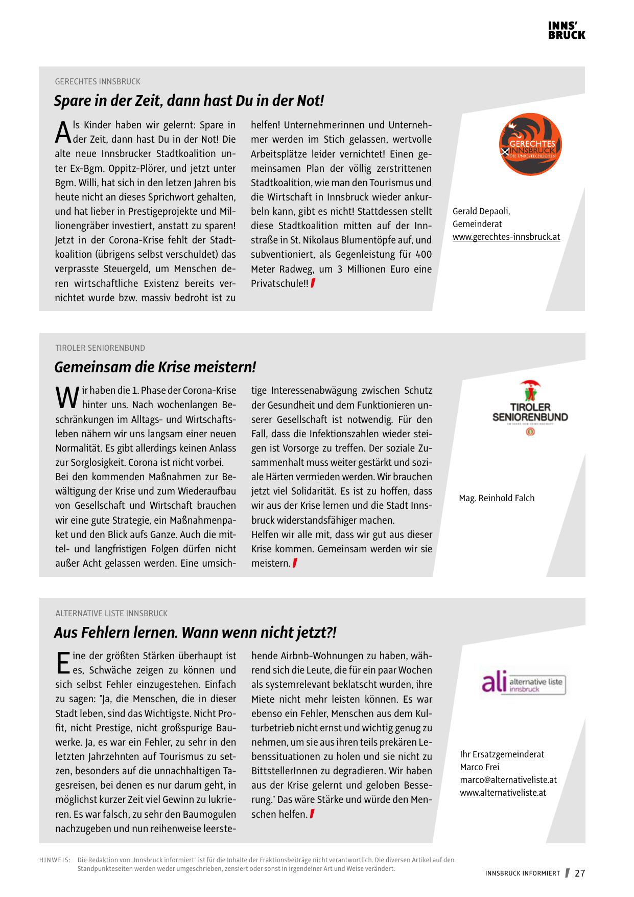 H I N W EI S : Die Redaktion von „Innsbruck informiert“ ist für die Inhalte der Fraktionsbeiträge nicht verantwortlich. Die diversen Artikel auf den