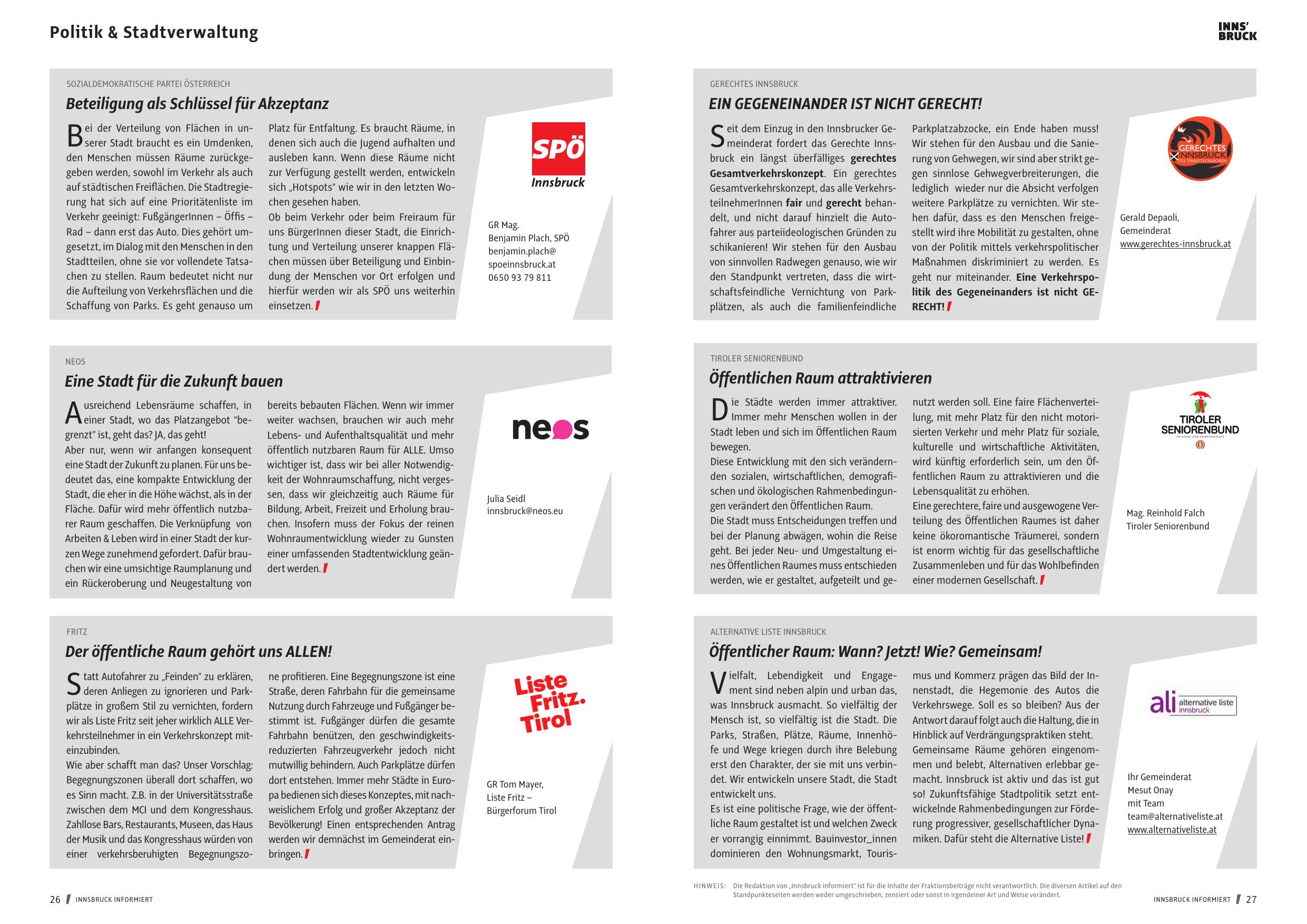 H I N W EI S : Die Redaktion von „Innsbruck informiert“ ist für die Inhalte der Fraktionsbeiträge nicht verantwortlich . Die diversen Artikel auf den