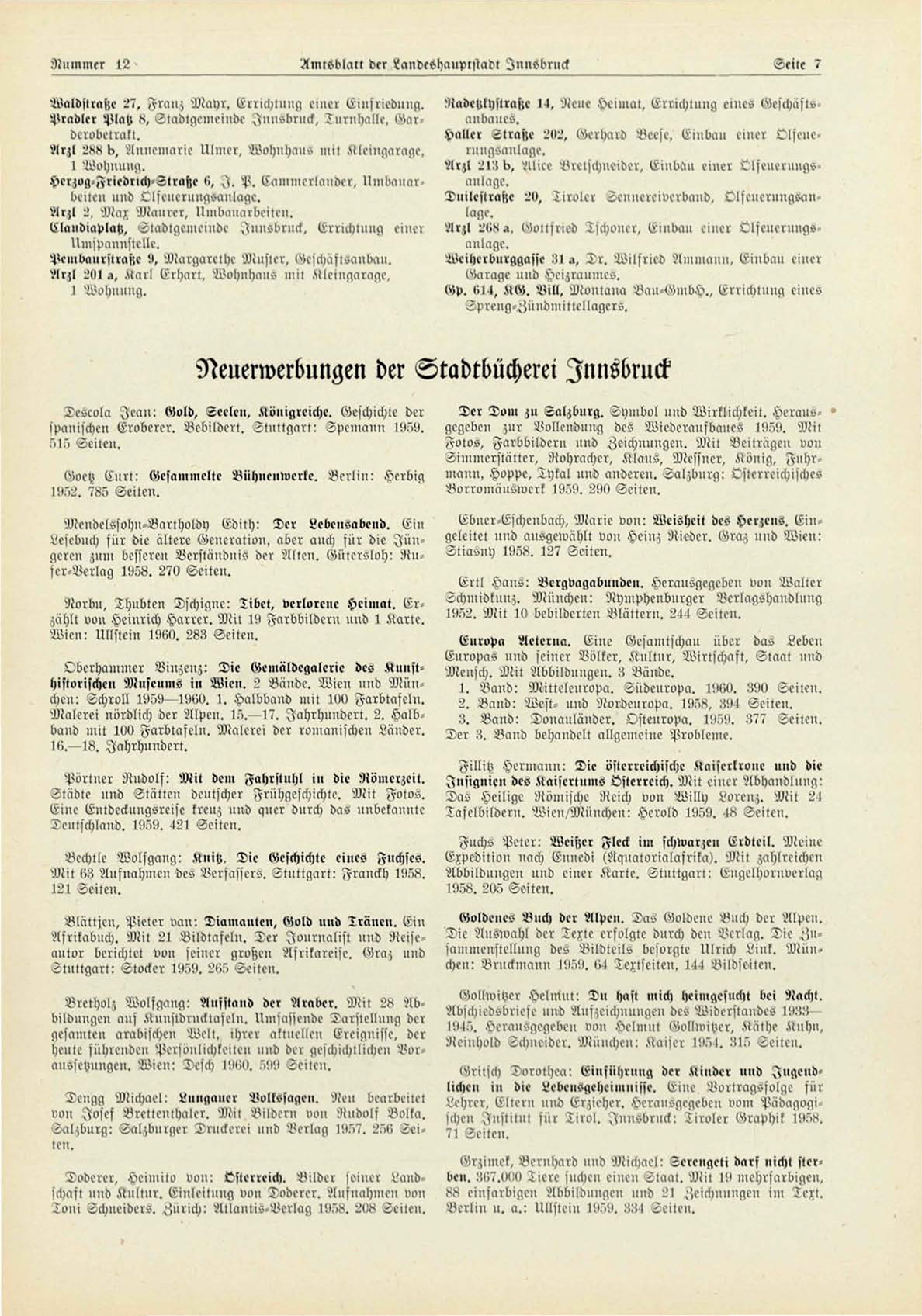 Neuerwerbungen der ^tadtbücherei Innsbruck