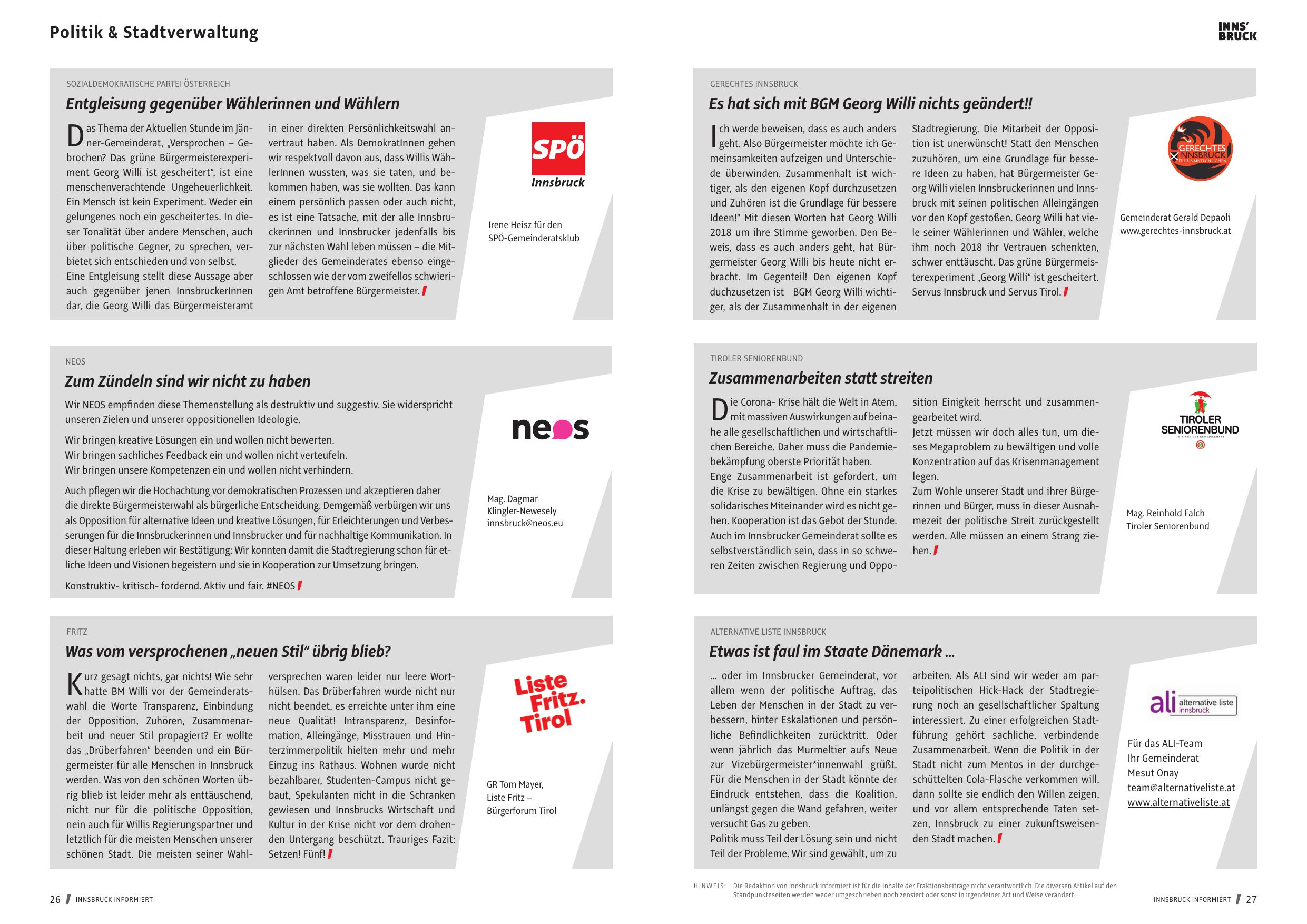 H I N W EI S : Die Redaktion von Innsbruck informiert ist für die Inhalte der Fraktionsbeiträge nicht verantwortlich . Die diversen Artikel auf den