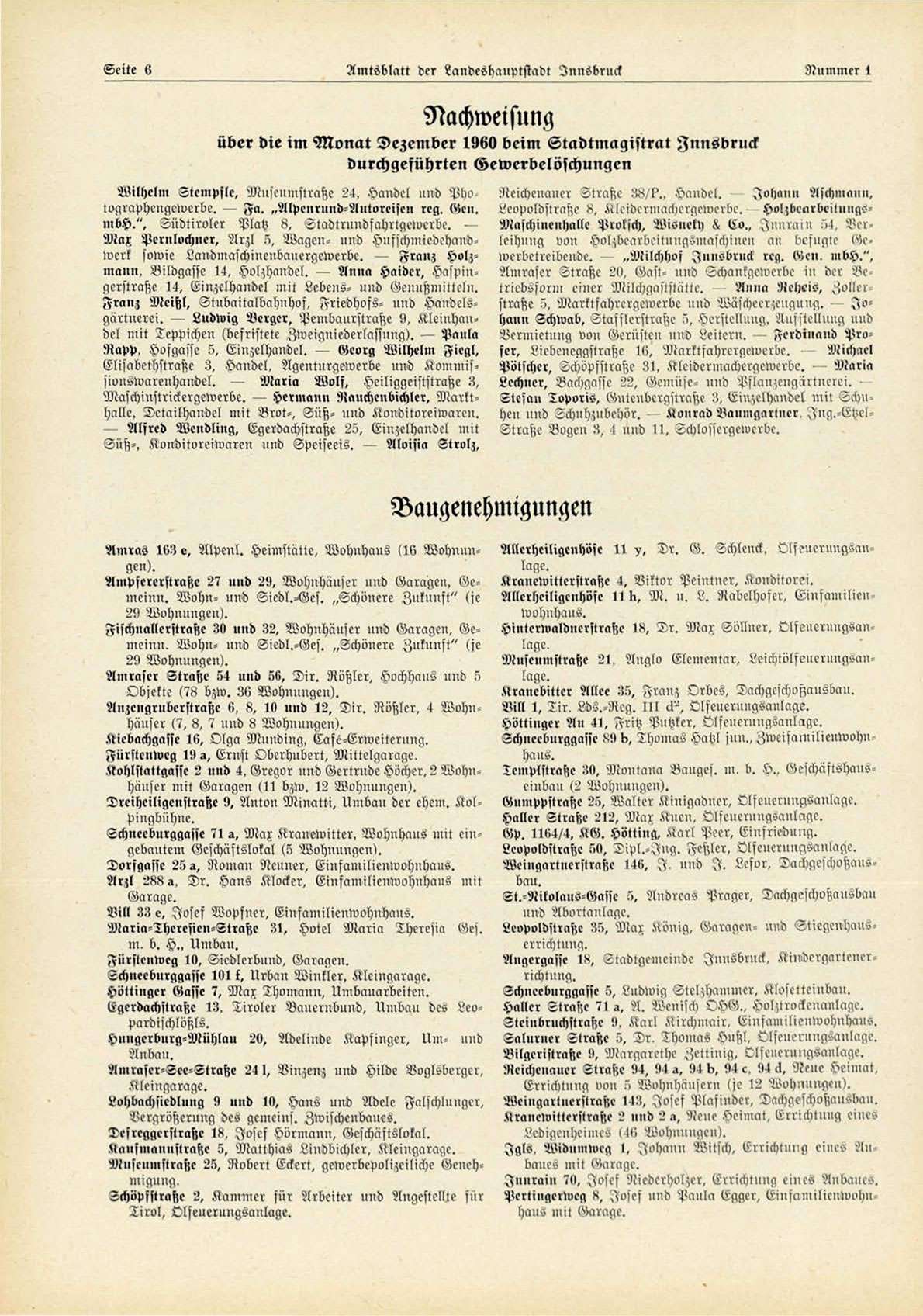 über die im Monat Dezember 1960 beim Stadtmagistrat Innsbruck