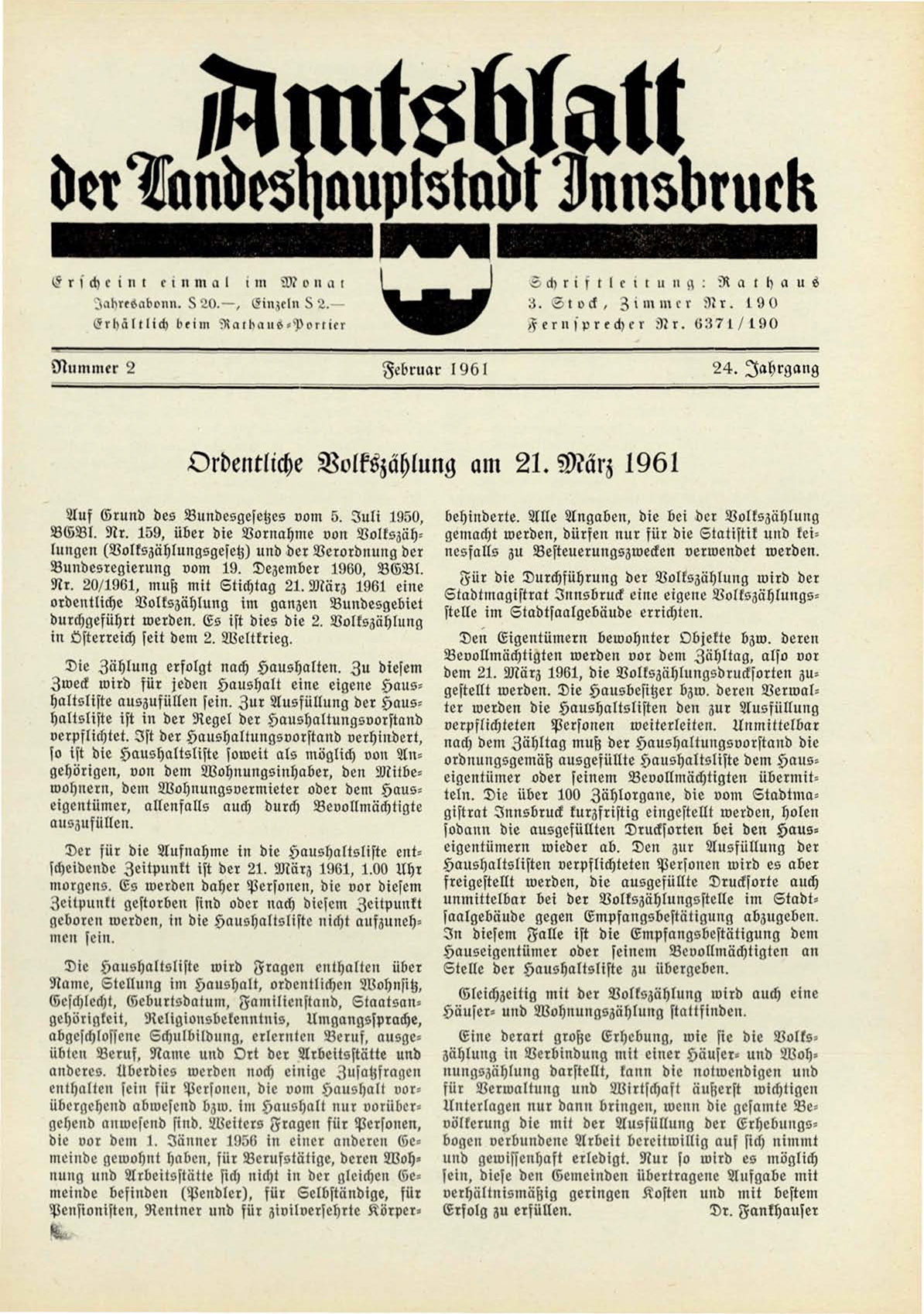 dem 21. März 1961, die Vollszählungsdrucksorten zugestellt werden. Die Hausbesitzer bzw. deren Verwalter werden die Haushaltslisten den zur Ausfüllung