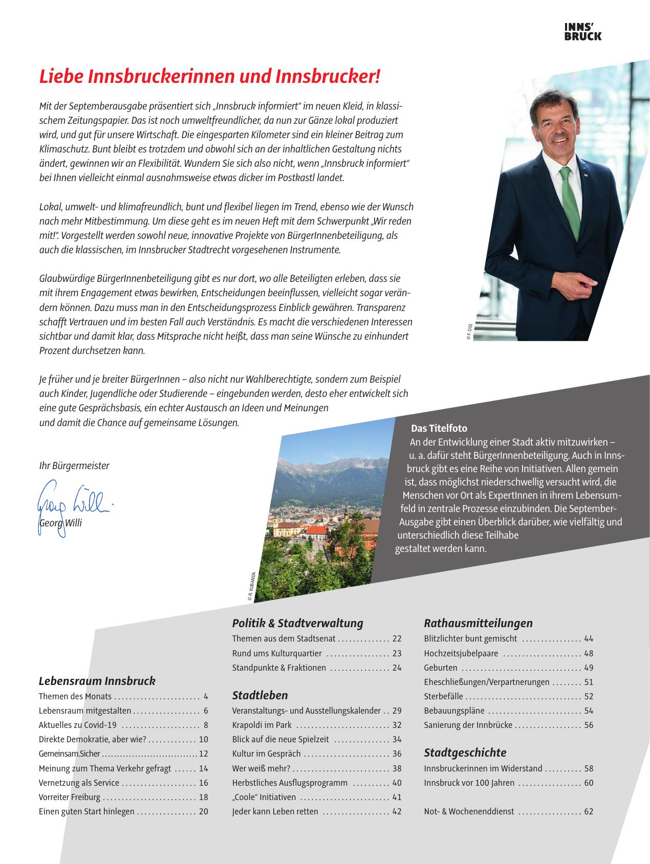 Mit der Septemberausgabe präsentiert sich „Innsbruck informiert“ im neuen Kleid, in klassischem Zeitungspapier. Das ist noch umweltfreundlicher, da nun zur Gänze lokal produziert