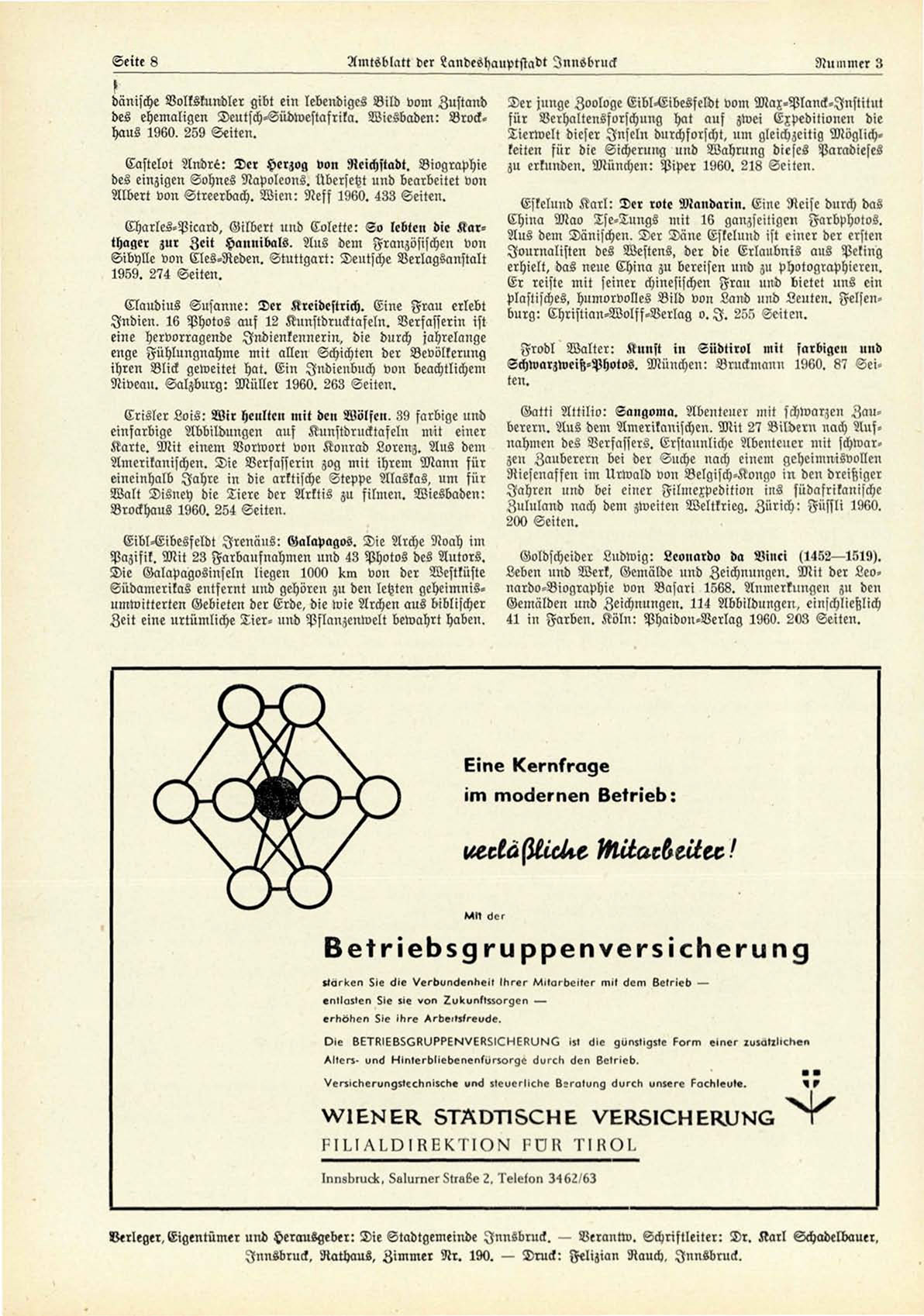 Verleger, Eigentümer und Herausgeber: Die Stadtgemeinde Innsbruck. — Veranrw. Schriftleiter: Dr. Karl Schadelbauer,