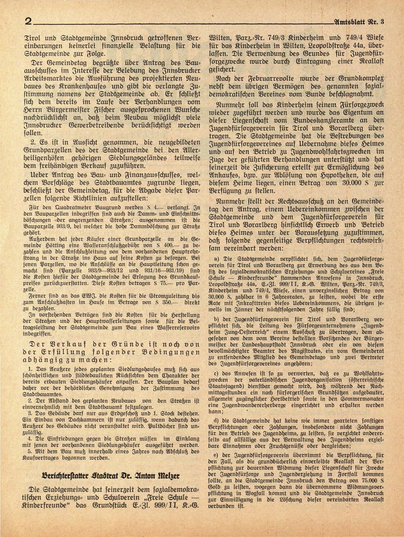 a) Die Stadtgemeinde verpflichtet sich, dem Iugendfürsorgeverein für Tirol und Vorarlberg zur Erwerbung des aus dem Besitz des sozialdemokratischen Erziehungs- und Schulvereines „Freie