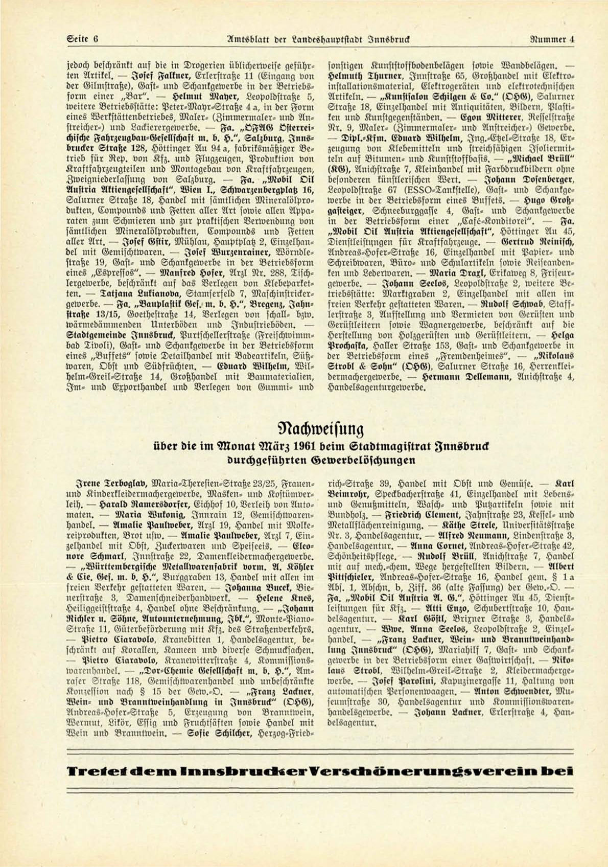 Fa. „Mobil Oil Austria A. G.". Höttingcr Au 45>, Dicnstleistungen für Kfz. — Atti Enzo, Schubcrtstraße IN, Handelsagentur. — Karl Göstl, Brirucr Straße 3, Handels«