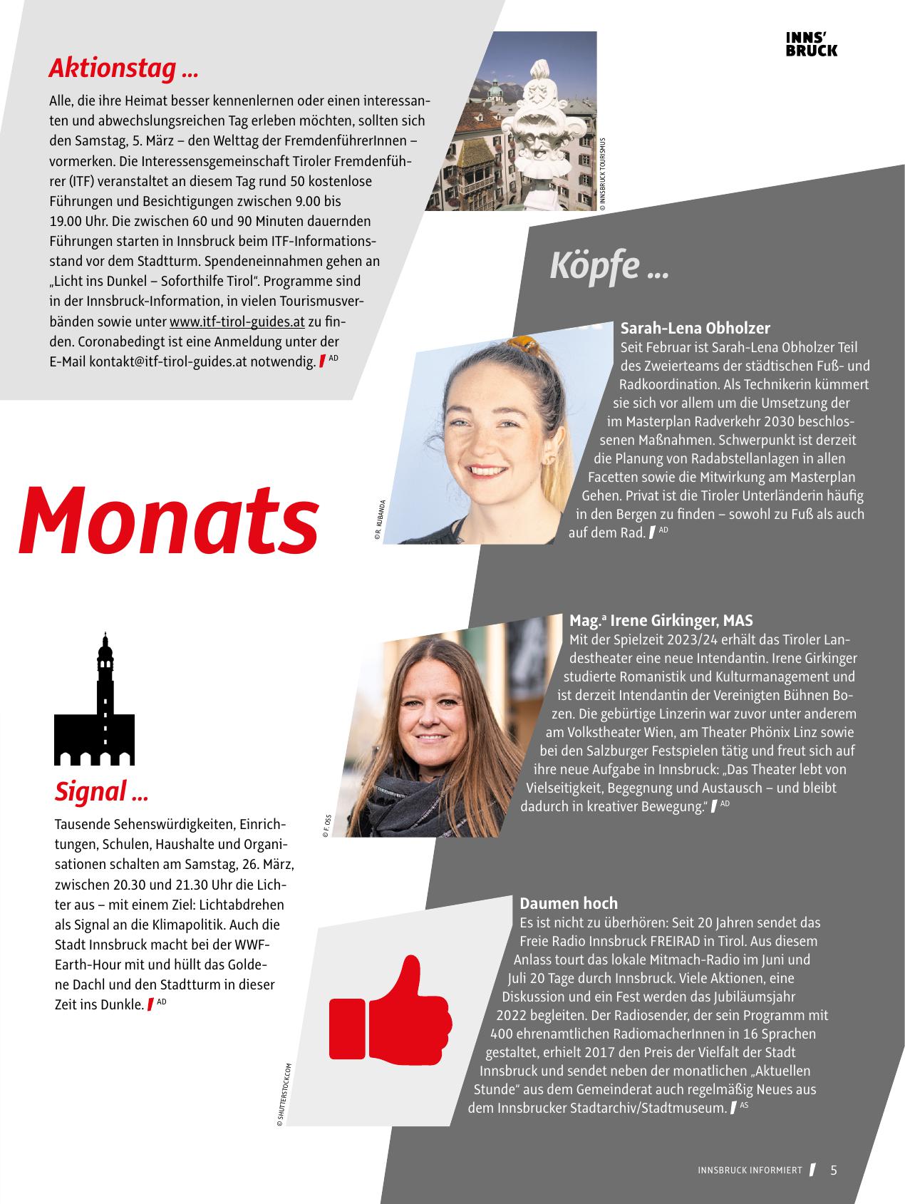 in der Innsbruck-Information, in vielen Tourismusverbänden sowie unter www.itf-tirol-guides.at zu finden. Coronabedingt ist eine Anmeldung unter der