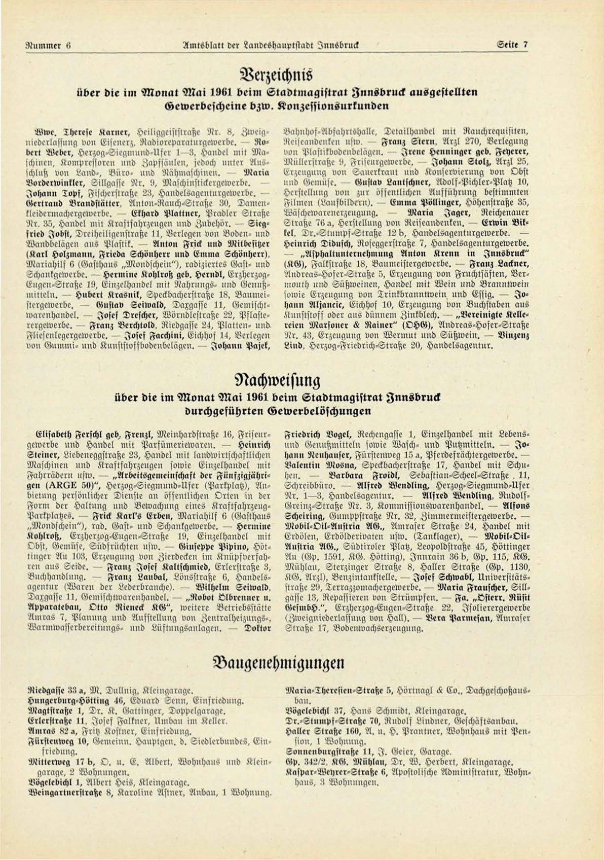 über die im Monat M a i 1961 beim Stadtmagistrat Innsbruck